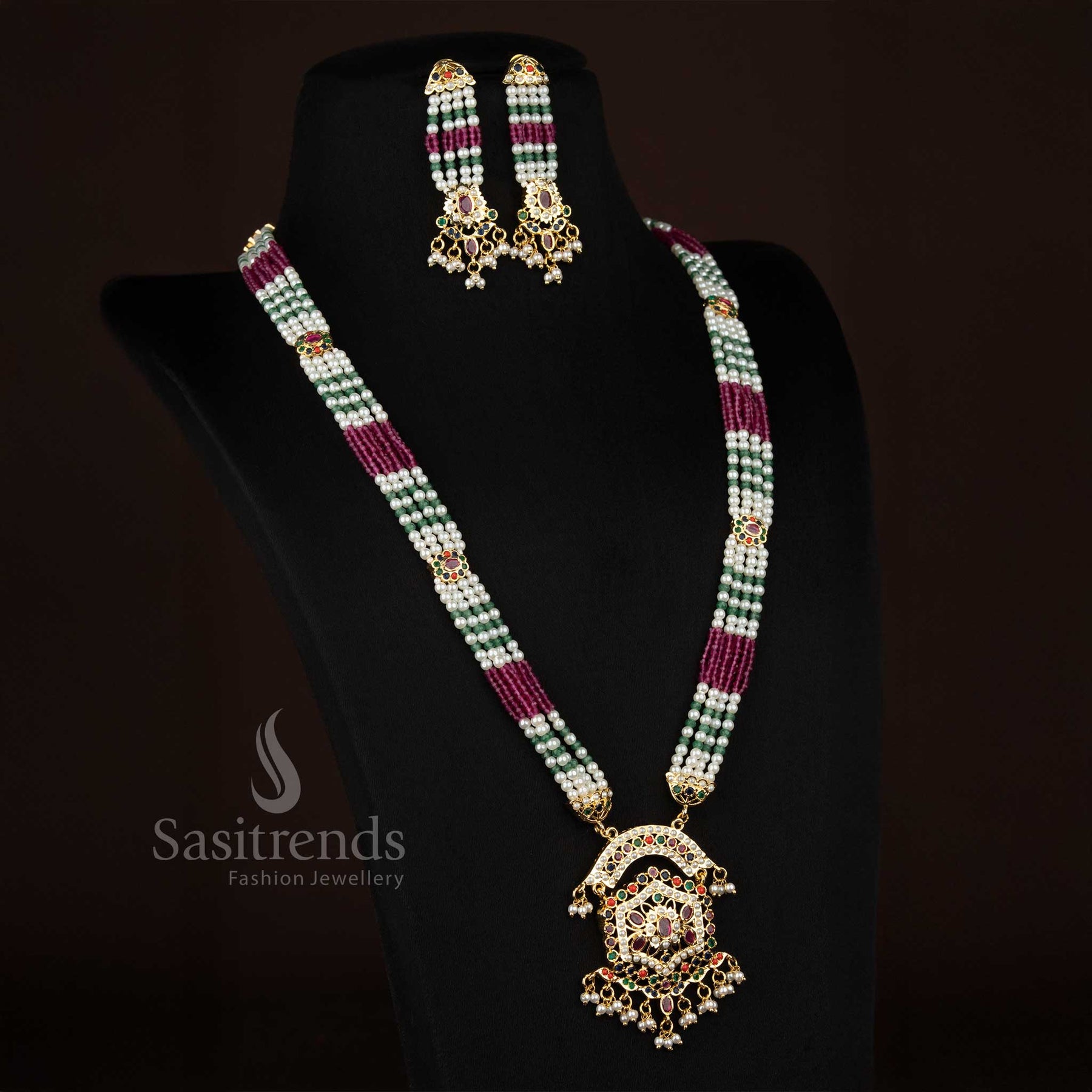 Elegant American Diamond Micro Gold Plated Arch Hexagonal Pendant Pearl Long Necklace Set for Contemporary Styling & Cultural Evenings