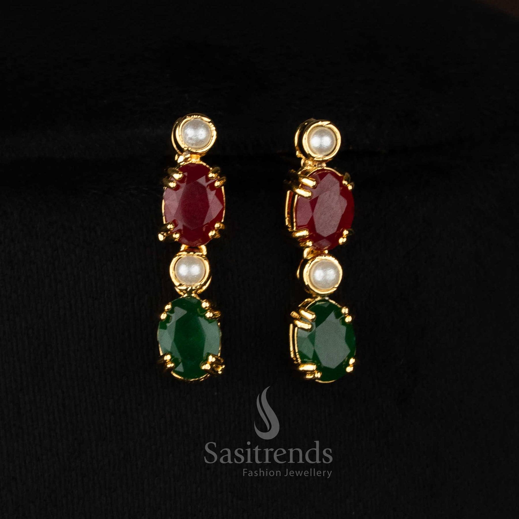 Guaranteed 24k micro gold plated american diamond pearl Round and Oval Teardrop motif ruby green necklace set by Sasitrends, Festive and special occassion wear