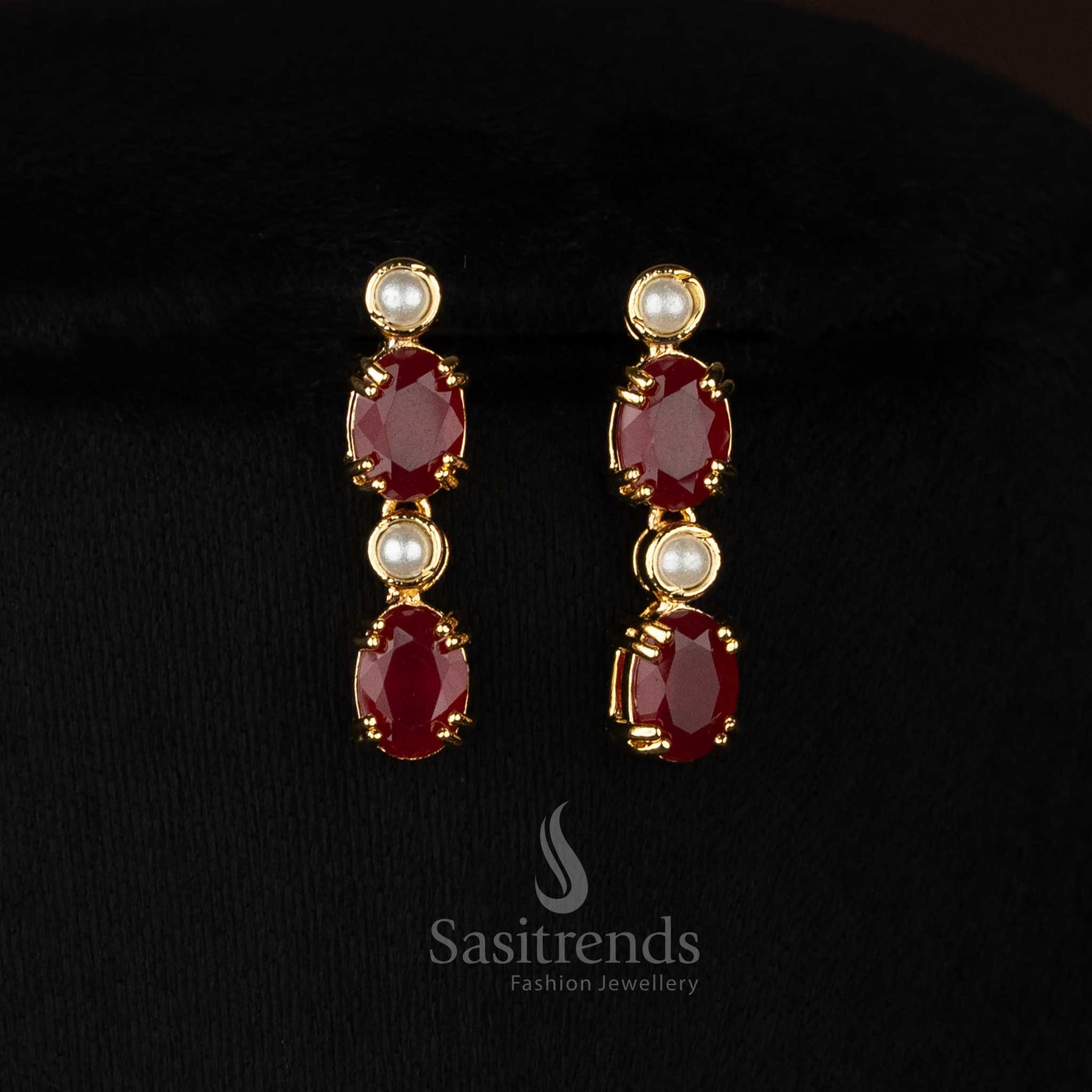 One gram micro gold plated american diamond pearl Round and Oval Teardrop motif ruby necklace set by Sasitrends, Look like real gold