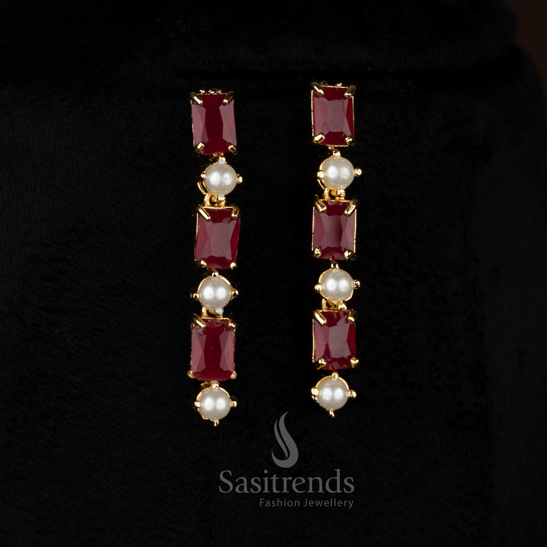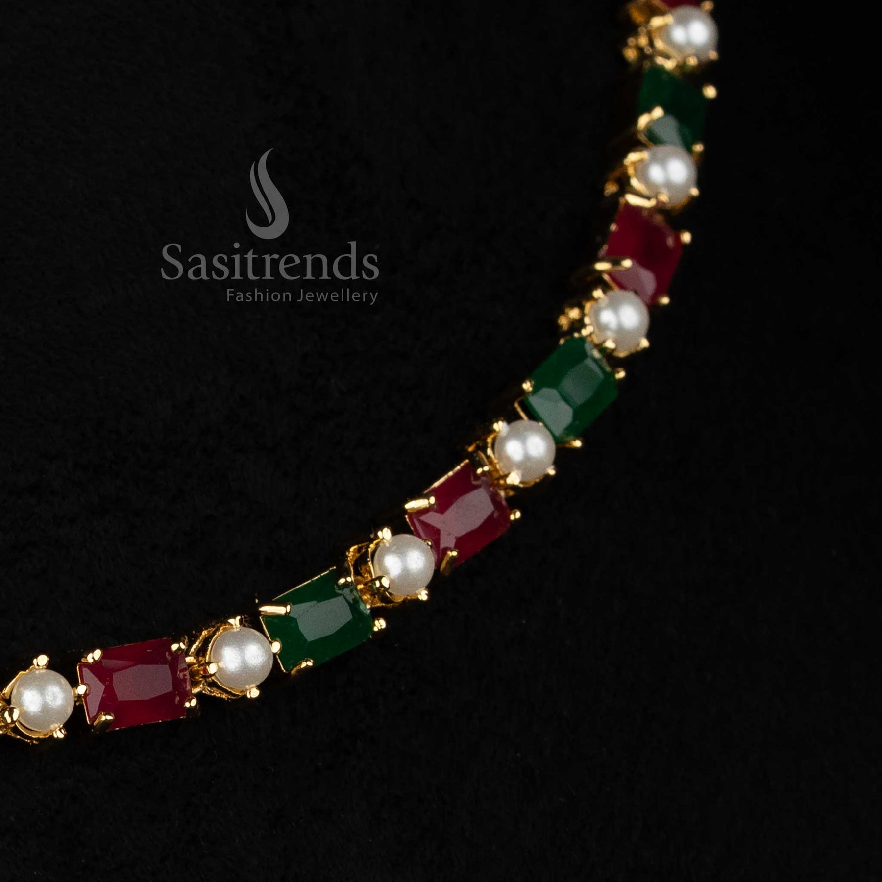 Description: This elegant 24k micro gold plated American Diamond necklace set is designed for party wear, engagement wear, festive occasions, and family functions. The jewellery features a clean and refined structure with a classic stone-and-pearl combination that gives a graceful and timeless appearance. The necklace is crafted using a rectangle-shaped American Diamond stone link design, where each rectangular stone is placed in a straight, uniform sequence. Between each rectangle stone, round pearl settings are added, creating a balanced and evenly spaced chain structure that sits neatly along the neckline. This alternating rectangle stone and pearl link structure enhances the visual rhythm of the necklace while maintaining a minimal and elegant profile. The consistent alignment of stones gives the jewellery a polished and premium finish suitable for both traditional and modern outfits. The matching earrings follow a vertical rectangle stone structure, featuring multiple rectangle-shaped American Diamond stones arranged in a straight drop pattern. Small pearl accents are placed between the stones, completing the coordinated design and adding soft contrast to the bold stone layout. Crafted with 24K micro gold plating, this American Diamond and pearl necklace set offers a look like real gold with long-lasting shine. The strong stone setting, precise rectangular structure, and pearl detailing make it perfect for engagement functions, parties, festive celebrations, weddings, and special occasions.