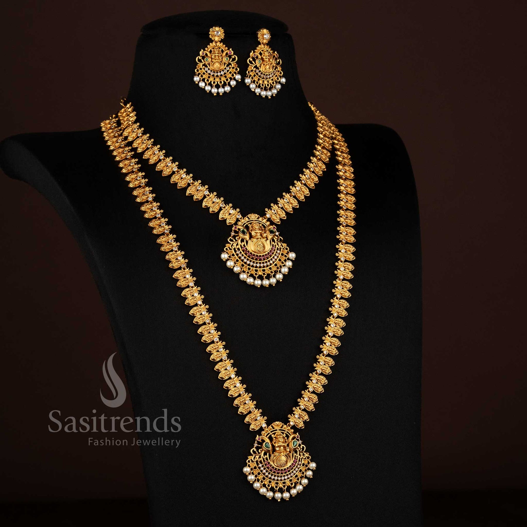 Description: Illuminate your festive and ceremonial attire with this Premium Matte Gold Plated Lakshmi Lotus Floral Temple Jewellery Set with pearls, crafted to perfection with intricate artistry and divine detailing. The central Lakshmi motif rests gracefully on a blossoming lotus, surrounded by delicate floral accents and sparkling stone highlights that shimmer beautifully under light. Designed for weddings, temple visits, cultural celebrations, engagement ceremonies, and festive gatherings, this jewellery set enhances sarees, lehengas, and designer ensembles with refined charm and radiant appeal. The matte gold plating accentuates the depth of each motif, highlighting exquisite craftsmanship and timeless design. This set is ideal for women seeking premium quality, luminous detailing, and statement-making accessories, combining traditional temple motifs with a polished, contemporary aesthetic. The harmonious interplay of lotus floral patterns and divine symbolism ensures every special occasion is marked with grace, sophistication, and captivating allure.