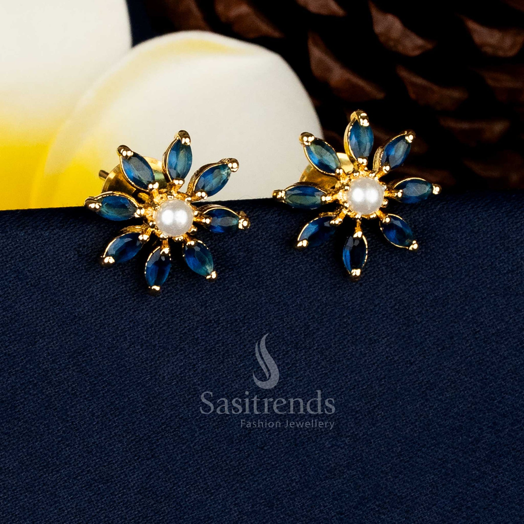 Description: These Micro Gold Plated Pearl Centre Starburst AD Stone Stud Earrings feature a beautifully arranged starburst formation that radiates outward with refined precision. At the centre sits a neatly set pearl, giving the design a classic and premium appeal suitable for everyday elegance and festive styling. Crafted with 24K pure gold micro plating, these earrings offer a guaranteed long-lasting shine and a finish that closely resembles real gold. The AD stones are set in a structured starburst pattern that adds dimension and enhances the rich, handcrafted detailing of the design. The symmetric placement of the marquise-cut stones adds balance and sophistication, making these studs perfect for traditional outfits, wedding events, ethnic wear and premium festive looks. The overall finish reflects expert craftsmanship with a focus on durability and brilliance. Every element of the stud is designed to deliver a premium touch, from the secure screw-back closure to the smooth gold plating that protects the piece from losing its shine. The pearl centre gives the earrings a graceful and timeless touch, making them versatile enough for multiple occasions. These earrings combine elegance, heritage-inspired artistry and micro gold plated premium finishing, making them an ideal choice for customers looking for a real-gold-like jewellery piece without compromising on quality.