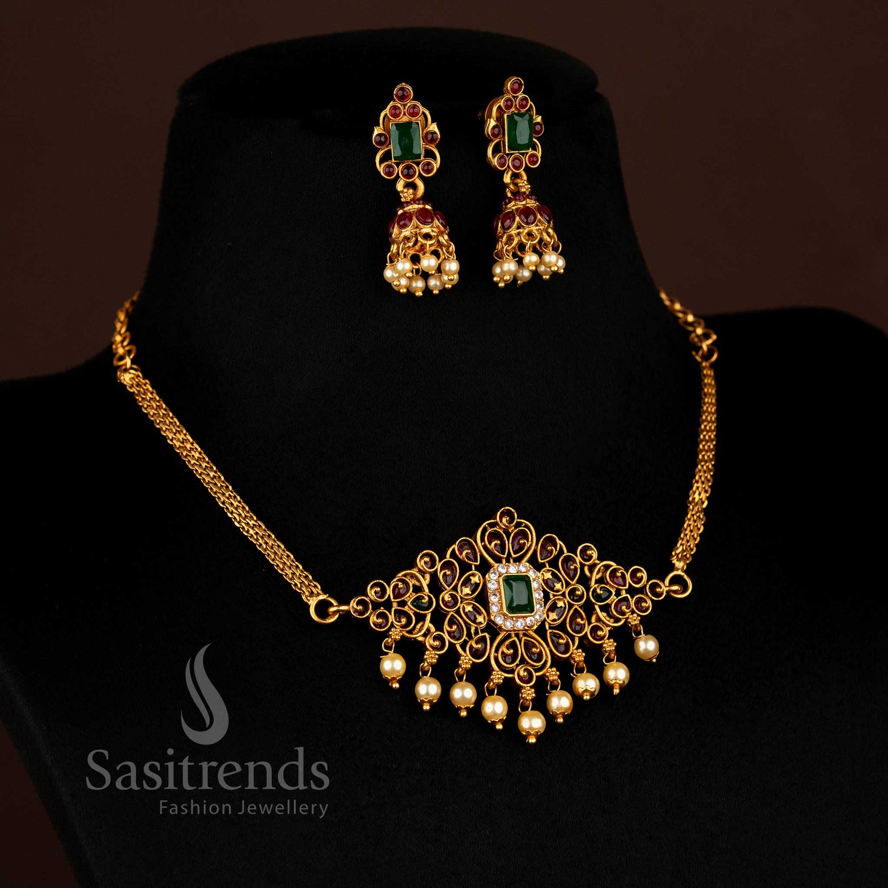 - Description: This Classic Matte Gold Plated Rectangular Stone Floral Choker Jewellery Set captures the beauty of traditional South Indian craftsmanship. The choker features rectangular stone patterns surrounded by intricate floral motifs, giving it a bold and regal look. The matte gold plating enhances the brass-like finish, offering a real gold appearance that perfectly complements festive and bridal attire. Designed with temple-inspired artistry, this choker set radiates cultural charm and elegance. It is ideal for saree wear, adding richness to any traditional ensemble. The structured rectangular stone design, paired with delicate floral detailing, makes it a standout piece for weddings, poojas, and festive celebrations. This jewellery set is budget-friendly and pocket-friendly, making luxury accessible for everyone. Though affordable, the finishing and craftsmanship reflect the same grandeur as premium temple jewellery collections, offering both quality and beauty in one. Whether you’re gifting your mother, grandmother, sister, or loved one, this choker set carries emotional value with timeless grace. Its traditional structure and goddess-inspired design make it a thoughtful present for special occasions like weddings or anniversaries. Perfect for brides, bridesmaids, or temple wear lovers, this choker jewellery set celebrates heritage and femininity. Pair it with silk sarees or Kanchipuram weaves for a divine and majestic look that will draw every eye toward you.