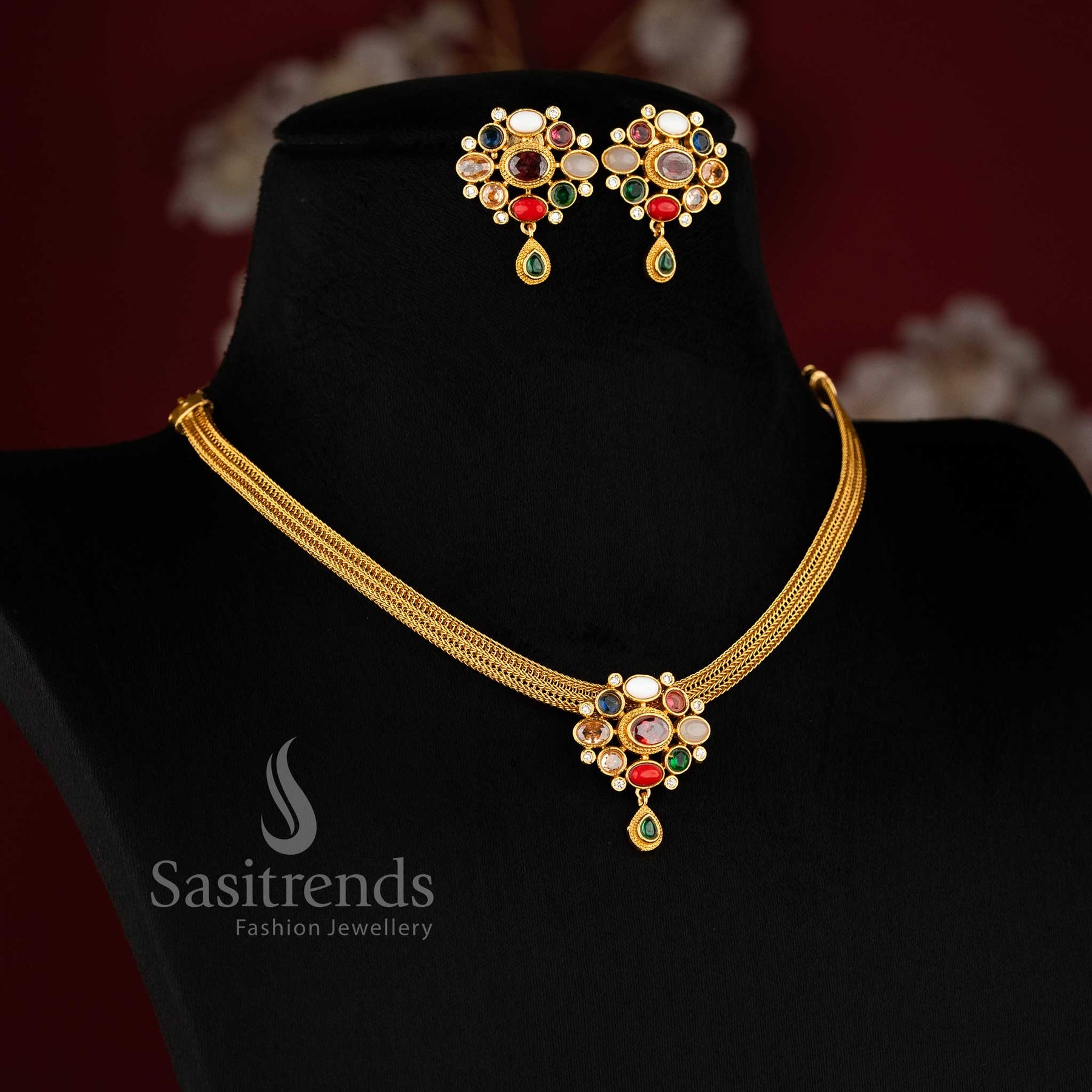 - Product Description: Elevate your traditional attire with our Matte Gold Plated Navrathna Choker Set featuring a stunning floral pendant and matching earrings. Crafted from high-quality brass and temple gold plated, this exquisite jewelry set is adorned with navrathna AD stones, creating a perfect blend of elegance and tradition. The choker necklace boasts a floral pendant center with an oval-shaped stone, surrounded by glistening navrathna AD stones. A delicate tear drop stone motif hangs gracefully at the base, adding a touch of sophistication. The pendant connects with an addigai-style flexible chain, ensuring a comfortable fit. Paired with the necklace, the matching earrings feature a floral pattern on top and mimic the pendant design at the bottom, with small tear drop stone motifs for a cohesive look. The entire set is ideal for pairing with sarees, half sarees, or any traditional outfit, making it a must-have for weddings, traditional parties, birthdays, and festive occasions.