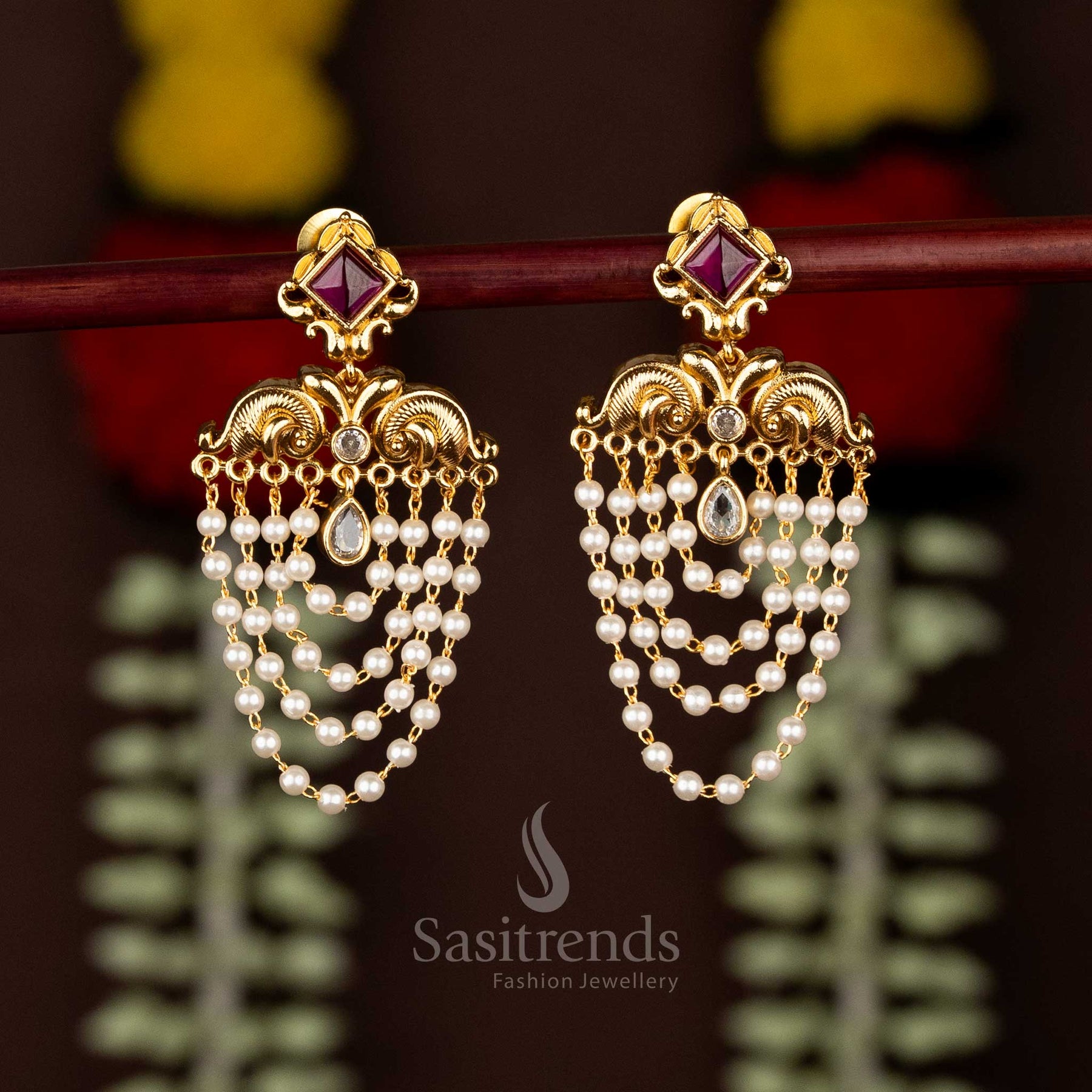 Temple Matte Gold Plated AD Stone Marquise-Cut Stud with Pearl Jhalar Drop Earrings – Premium Temple & Bridal Jewellery