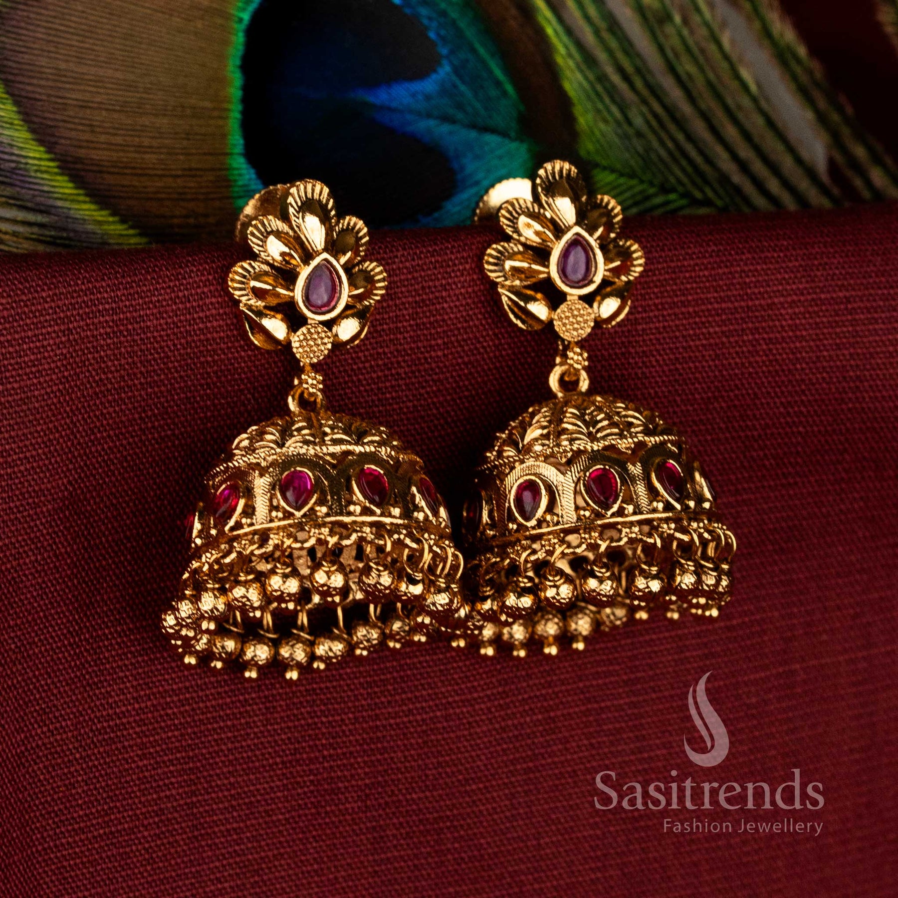 Traditional Temple Wear Premium Matte Gold Plated Floral Designer Small Jhumka Earrings