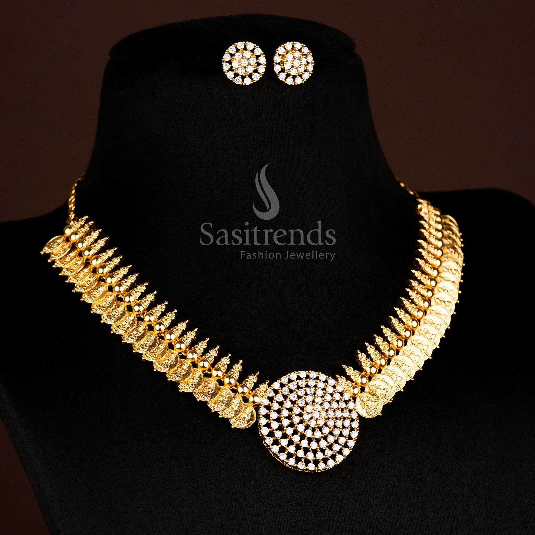 • Brand: Sasitrends crafts premium temple-inspired jewellery featuring divine motifs, matte gold finishes, and AD stone embellishments. Each creation celebrates traditional artistry, elegance, and cultural heritage. Perfect for festivals, temple ceremonies, and special occasions, Sasitrends ensures that every piece reflects luxury, craftsmanship, and timeless temple-inspired sophistication.