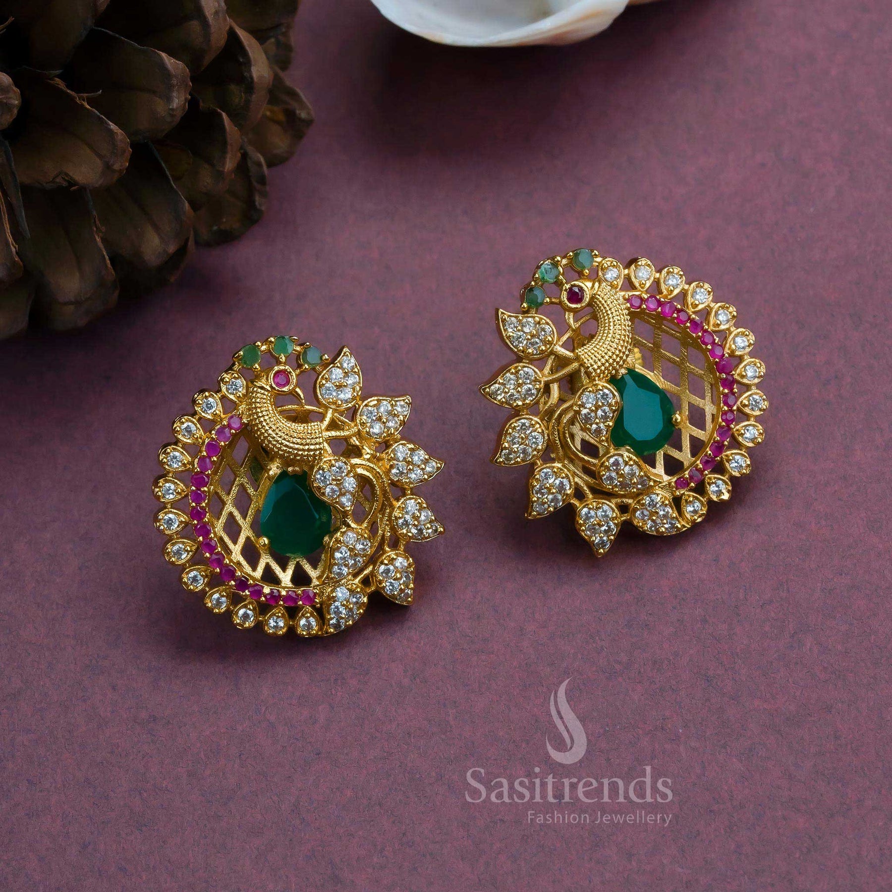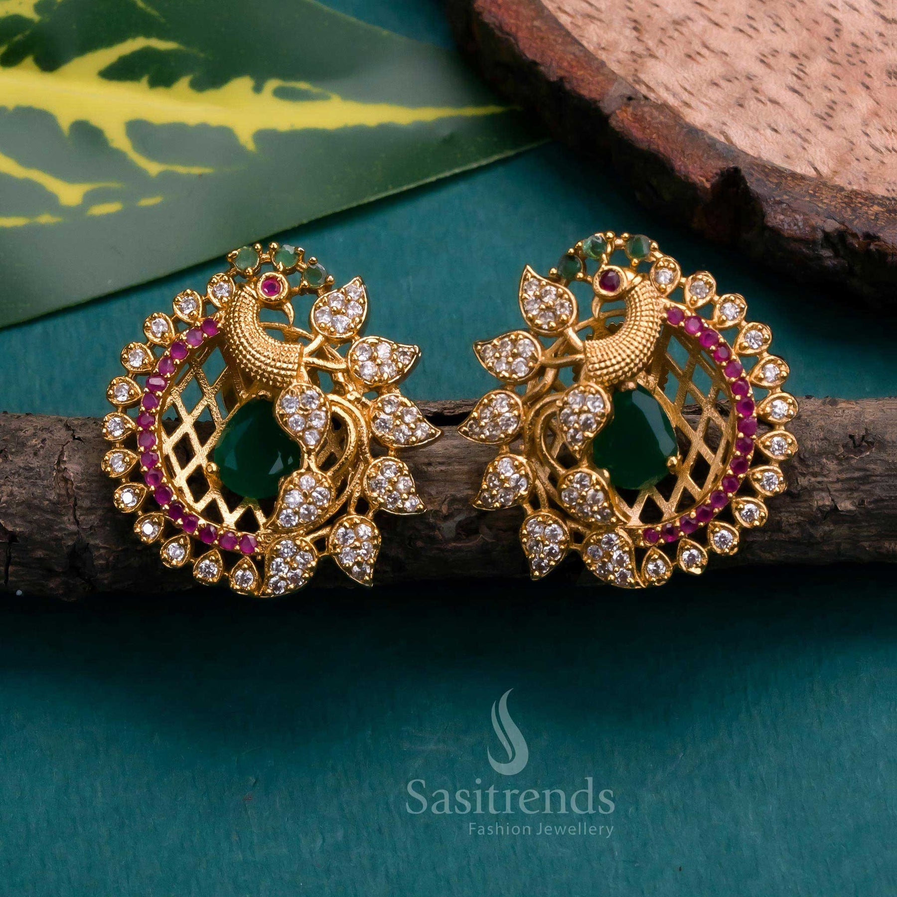 Feathered Elegance Peacock Stud Earrings-Temple Matte Gold Plated AD Earrings | Sasitrends
