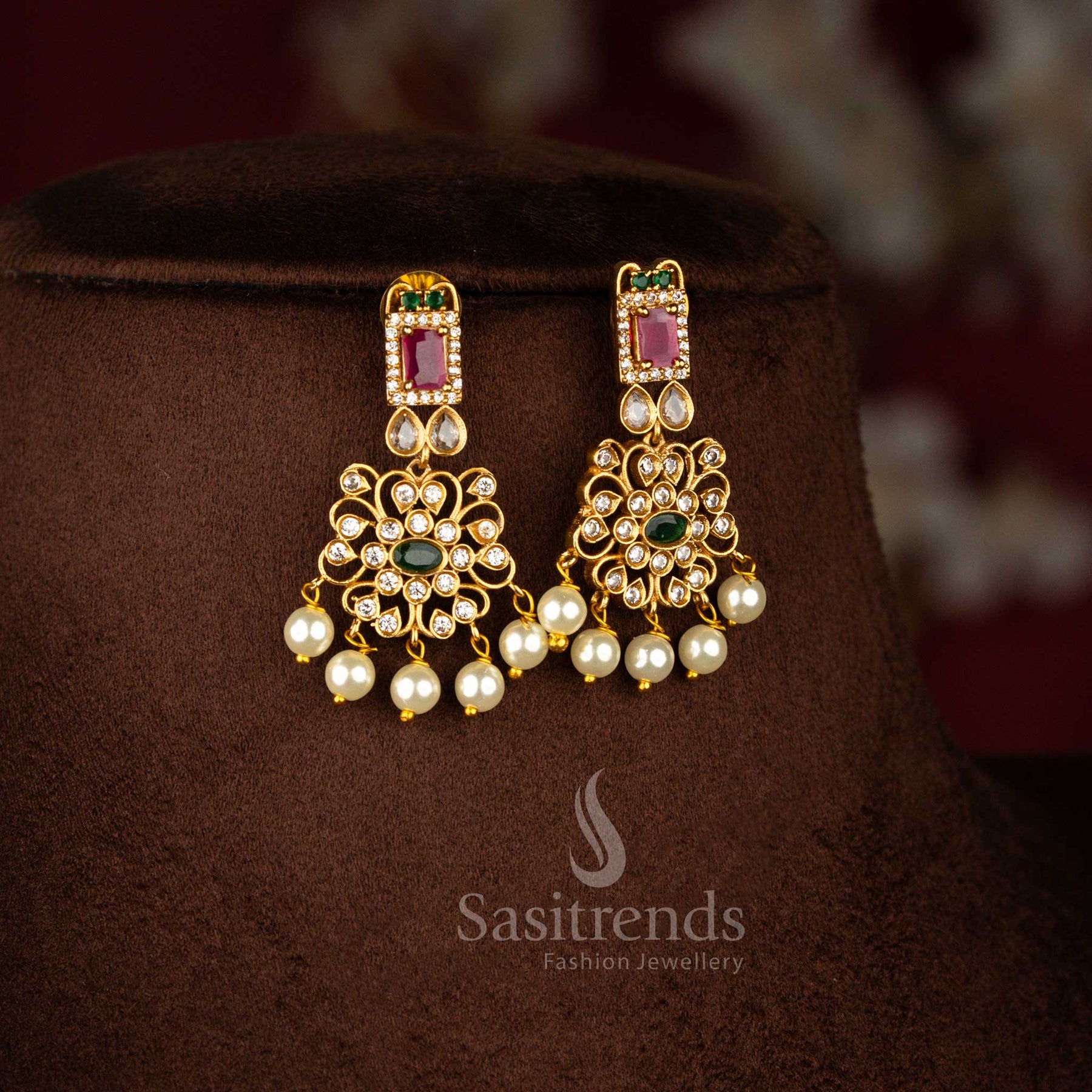 Exquisite Party Wear Temple Matte Gold Plated Floral AD Necklace Jewellery Set for Women | Sasitrends