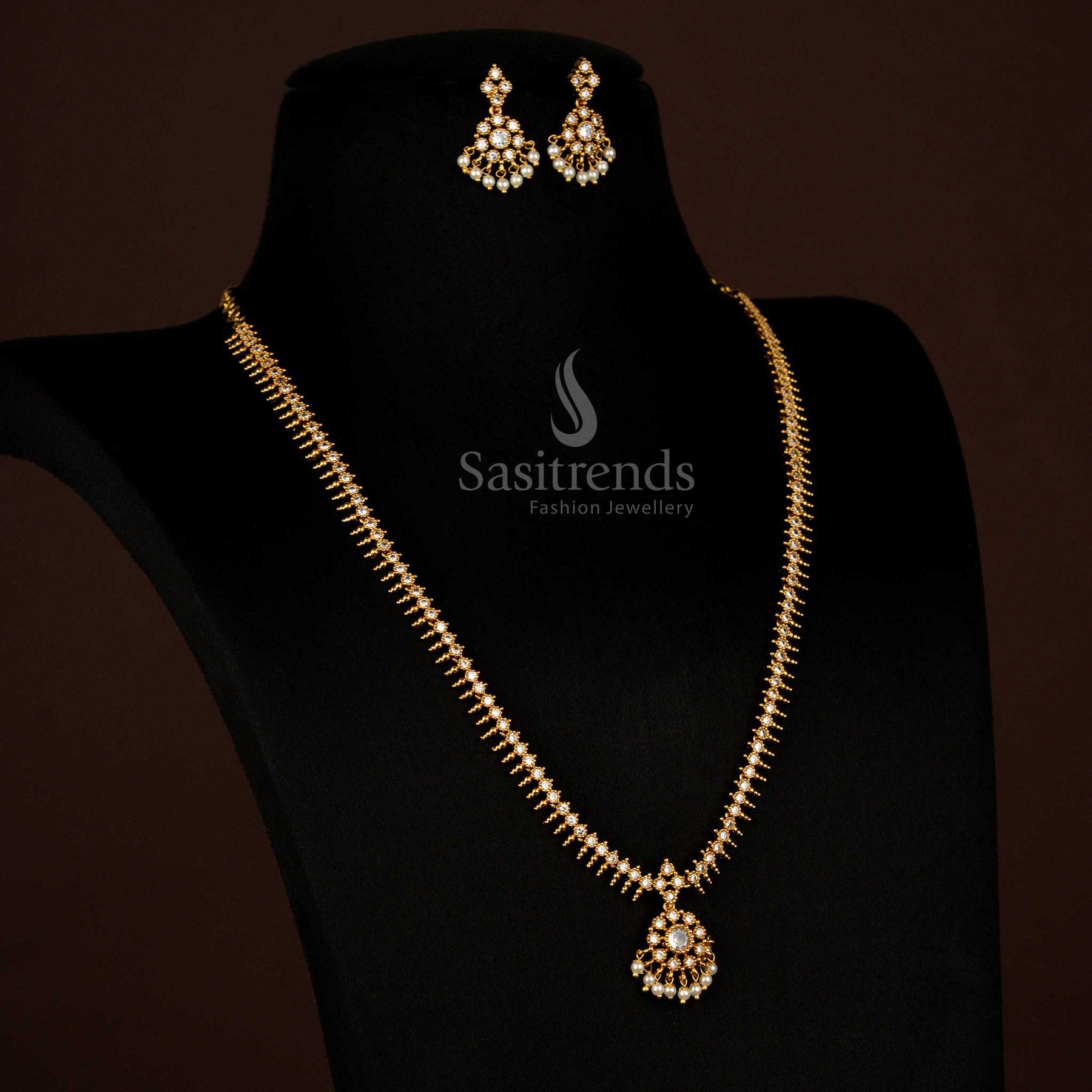 Elegant matte gold AD stone Necklace embellished with sparkling white circular floral patterns in dangle style for temple occasions and bridal celebrations – Sasitrends