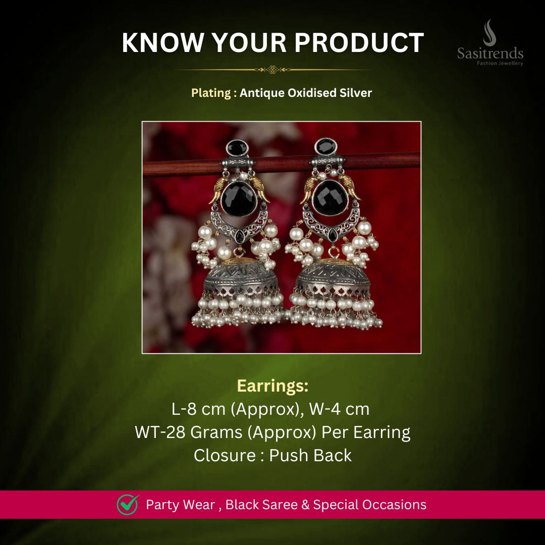 Description: Aranya Prism in design expression, these Antique dual tone 92.5 silver plated trendy oxidised dangler earrings are defined by a sculpted bird crescent silhouette enriched with teardrop and oval Monalisa stones and finished with elegant pearl accents. Every element is placed to create a striking contrast between polished stones, soft pearls, and textured oxidised surfaces.The bird crescent form frames the face beautifully, while the Monalisa stones introduce smooth depth and luminous character through their teardrop and oval cuts. The pearl detailing adds gentle movement and refined softness, balancing the bold structure of the earrings. The dual tone oxidised finish enhances the layered detailing, giving the piece a premium silver-inspired appearance.Designed especially for party wear styling, festive nights, evening celebrations, cultural soirées, social gatherings, and statement-focused occasions, these danglers pair effortlessly with party sarees, designer blouses, fusion dresses, Indo-western outfits, draped skirts, and contemporary ethnic ensembles. The elongated silhouette ensures standout presence under evening lights.A confident choice for jewellery lovers seeking dual tone 92.5 silver plated oxidised earrings with prominent stones and pearls, crafted for expressive party wear and elevated festive looks.