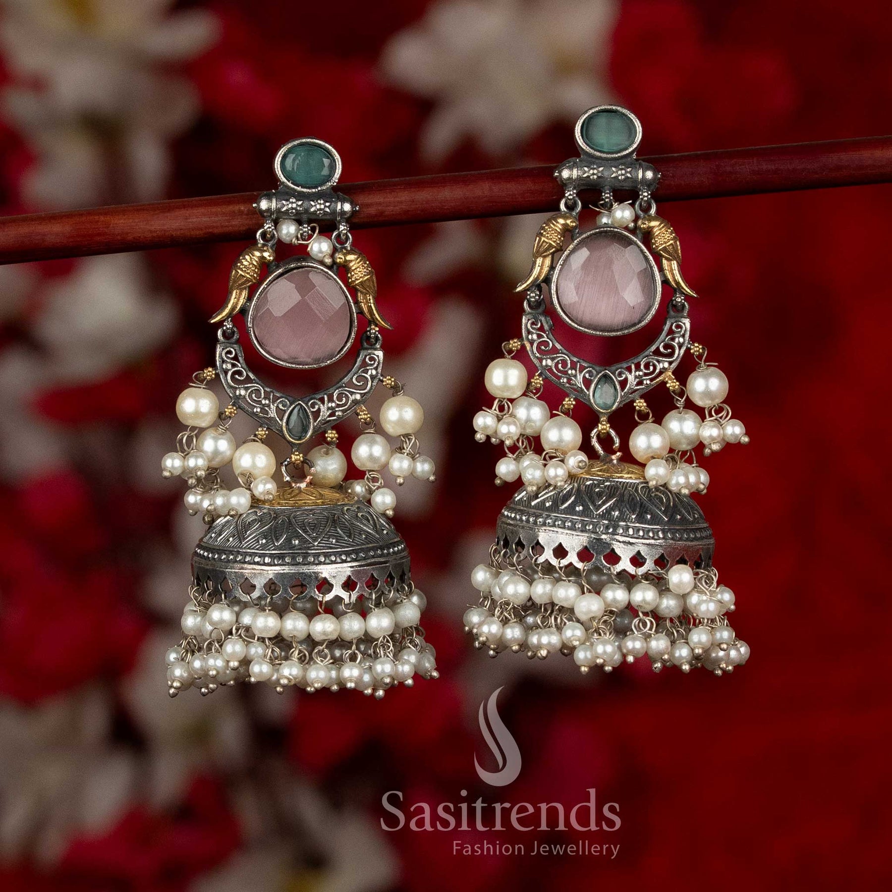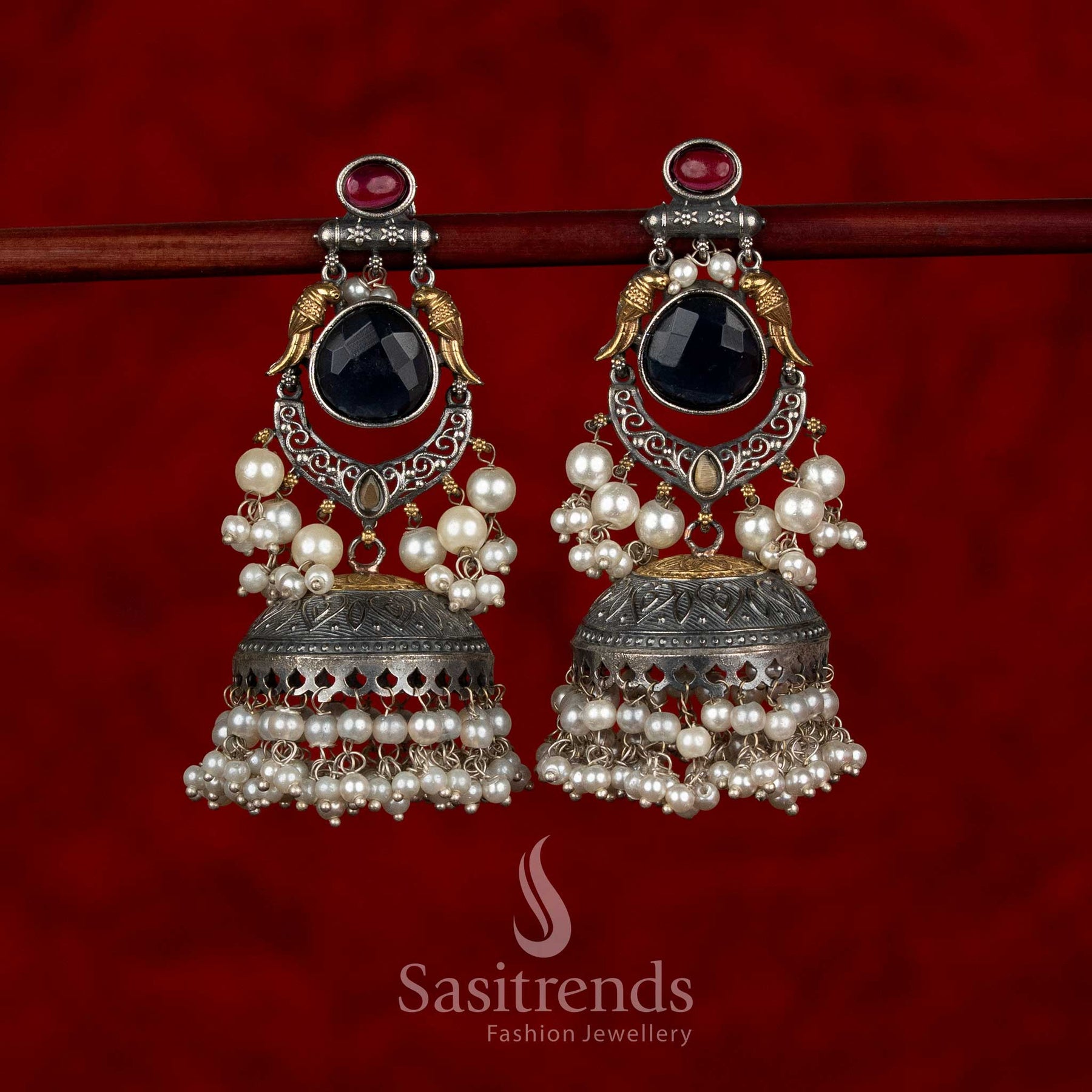 - Care: Store the earrings in a dry, separate box after use. Avoid contact with water, perfumes, sweat, and chemicals. Wipe gently with a soft, dry cloth to preserve the oxidised finish, stone detailing, and pearl accents.