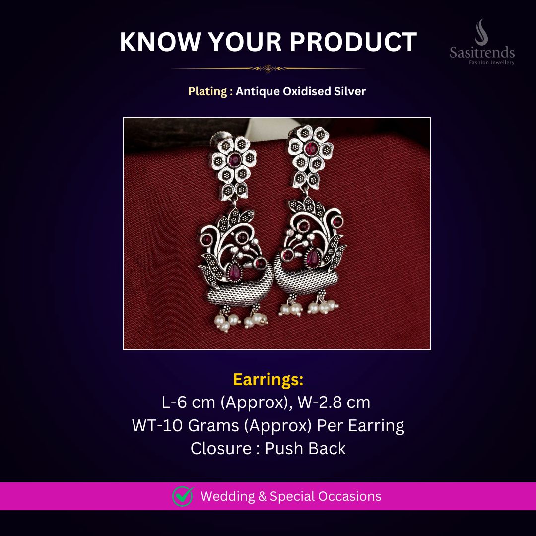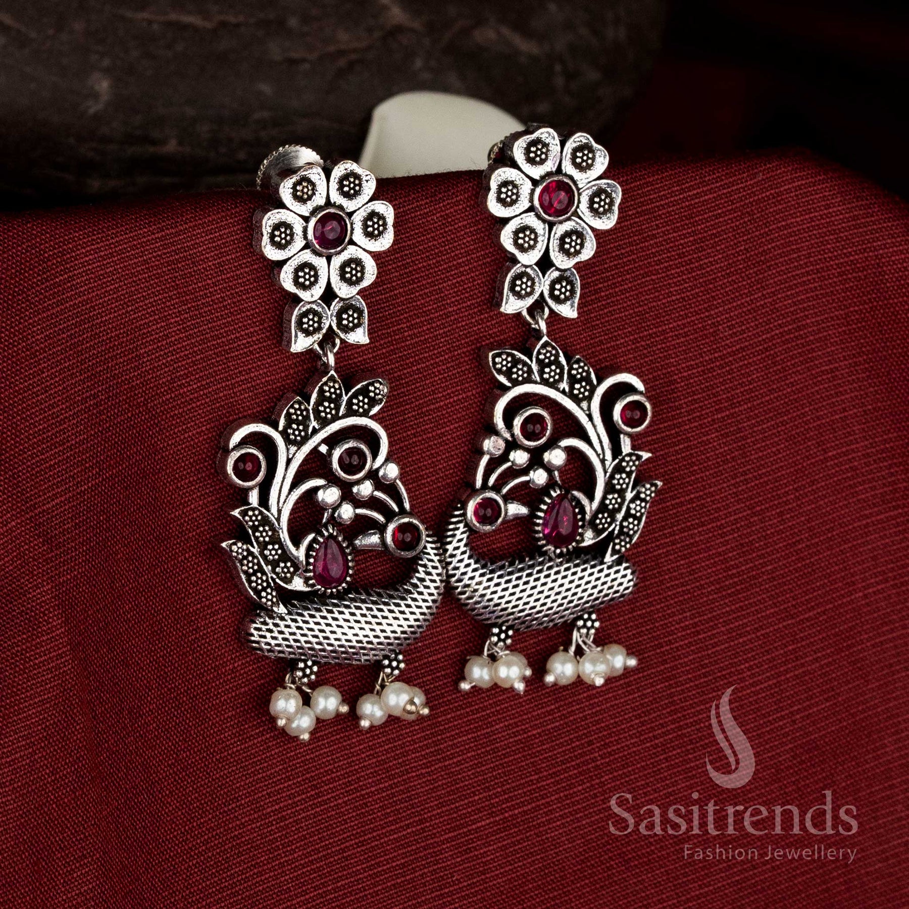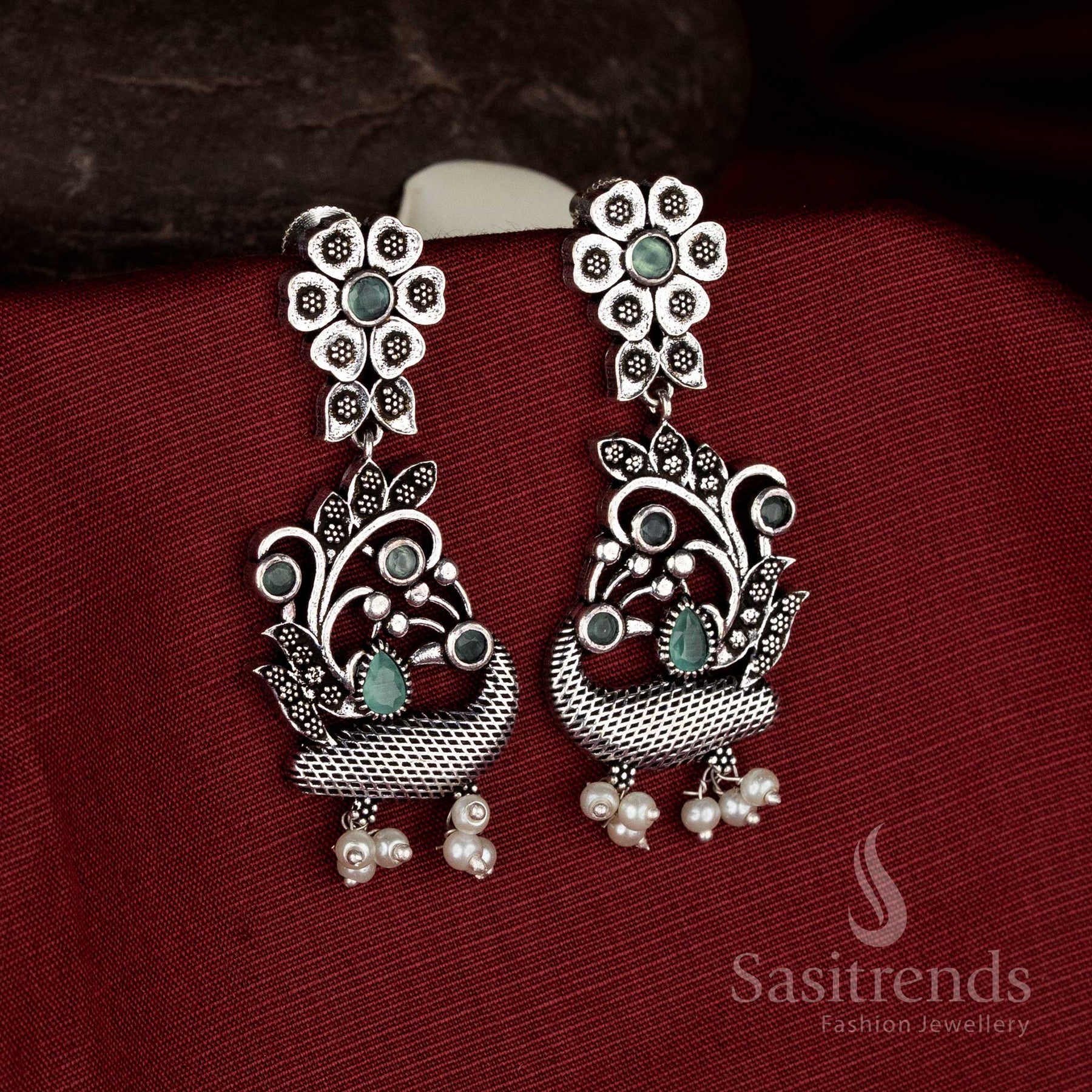 Charming Oxidised Silver Floral Pearl Peacock Earrings with Pearl Drops for Navarathri Wear
