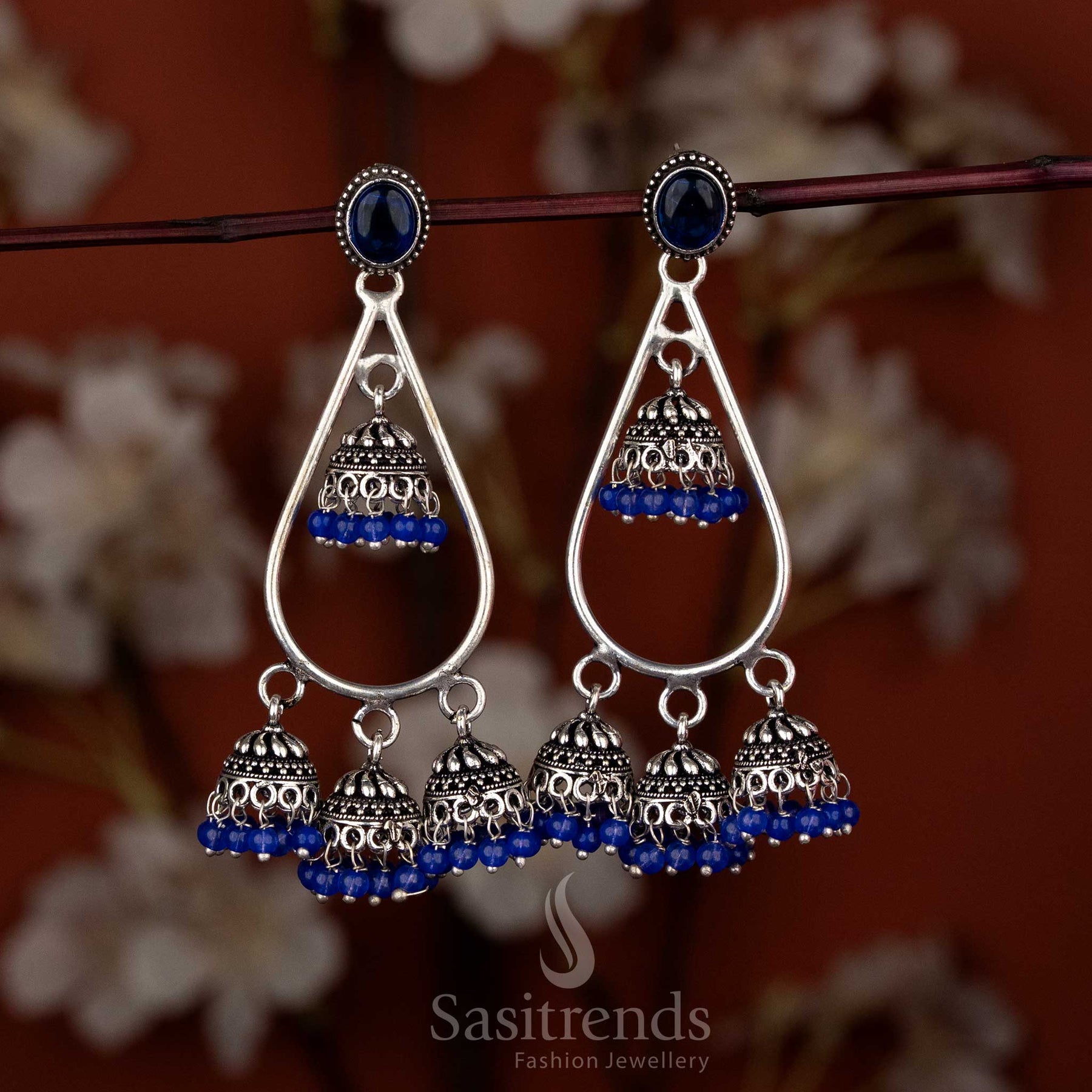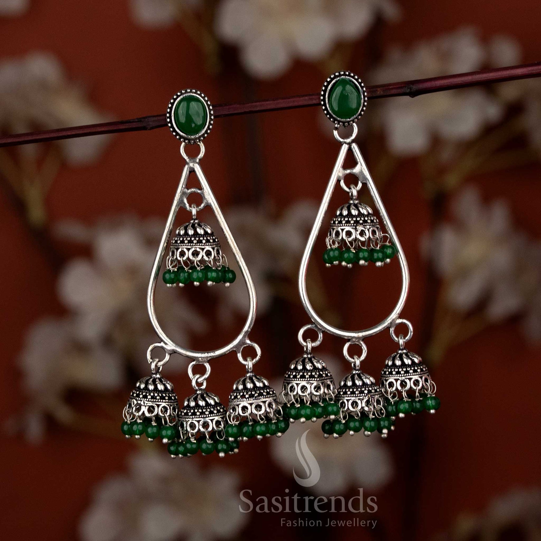 Brand: Sasitrends presents premium Oxidised Silver Plated Teardrop Stone Mini Jhumka Earring, ideal for sarees and ethnic wear. Lightweight and intricately designed with teardrop stones, these earrings enhance Navaratri, temple visits, poojas, and family gatherings, offering refined beauty and lasting elegance.