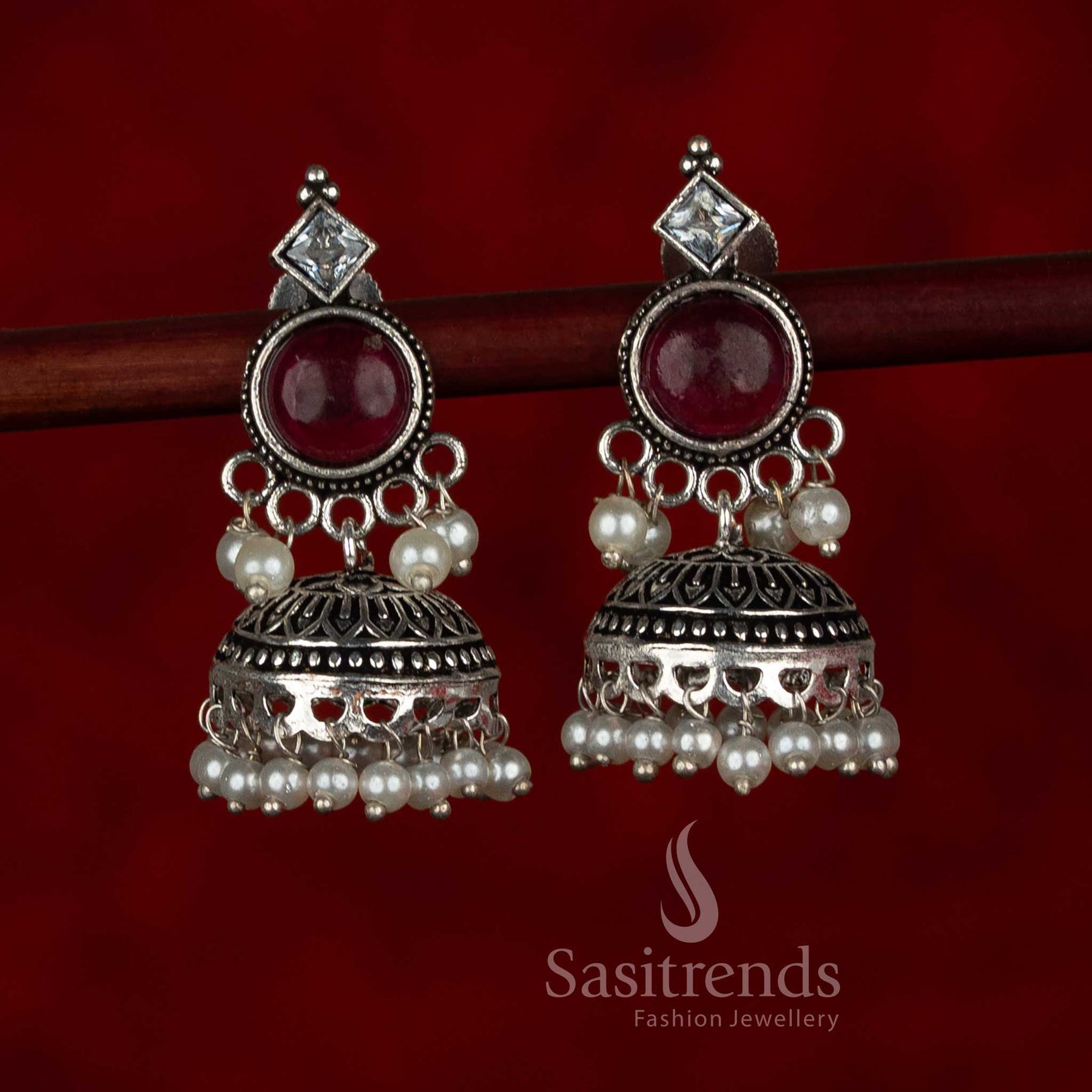 - Description: These oxidised silver plated jhumka earrings are designed with a classic circular stud and dome drop structure, reflecting ethnic heritage aesthetics through a well-balanced and detailed form. The earrings follow a traditional jhumka silhouette enhanced with refined silver craftsmanship. The upper portion features a geometric connector leading into a prominent circular stud. The stud is bordered with engraved silver detailing that adds depth and creates a strong visual foundation for the drop element below. Suspended beneath the stud is a structured dome-shaped jhumka crafted with intricate cutwork and engraved surface patterns. The dome maintains a rounded, symmetrical form that enhances the traditional appeal of the earrings. The lower edge of the jhumka is finished with a uniform row of pearl bead hangings, adding graceful movement to the design. Additional pearl drops beneath the circular stud connect the upper and lower sections, completing the layered structure. Suitable for festive wear, Navarathri celebrations, weddings, ethnic functions, and office ethnic styling, these earrings pair beautifully with sarees, kurtas, and traditional outfits. The design is available in many colors, making it versatile and ideal as a gift for a loved one or sister.