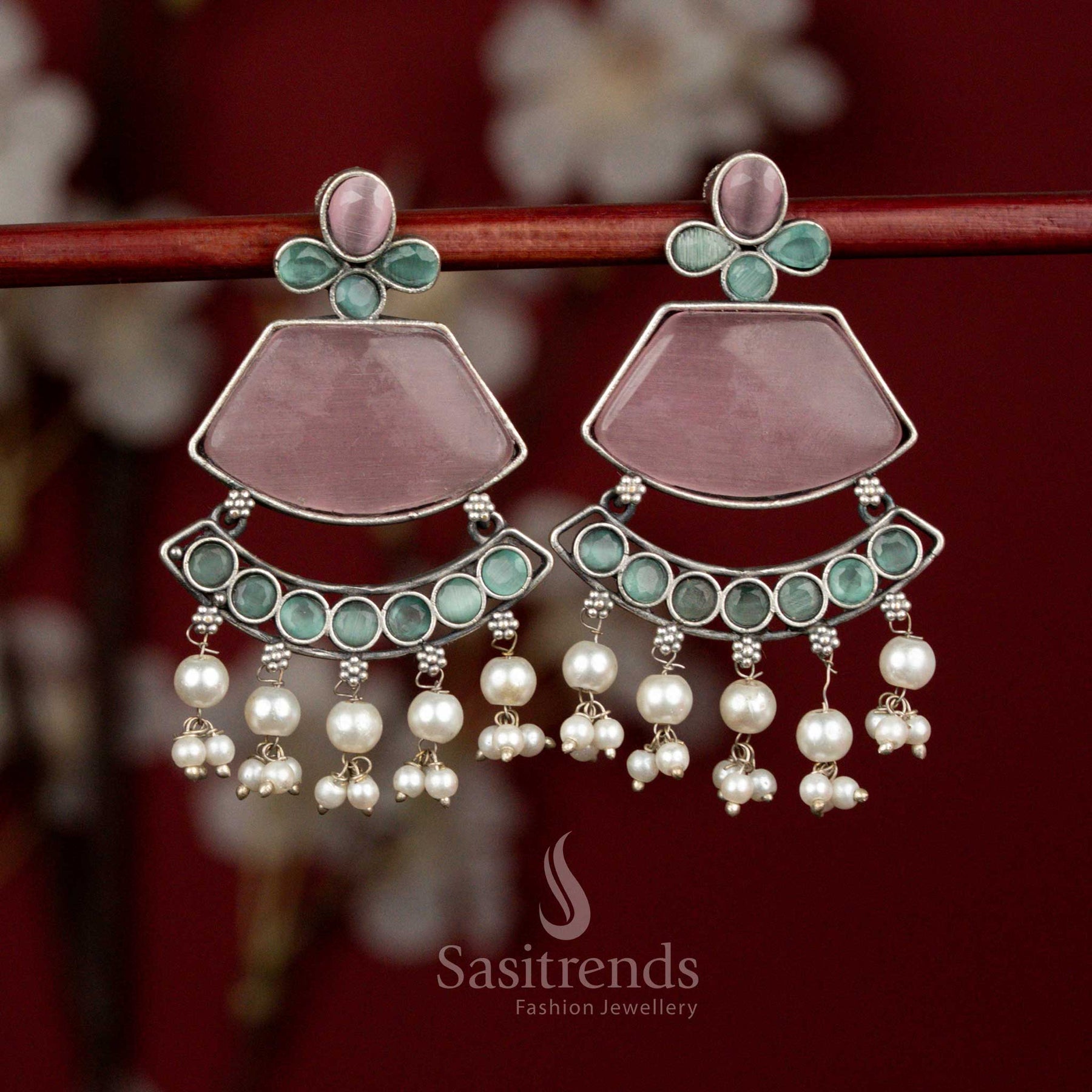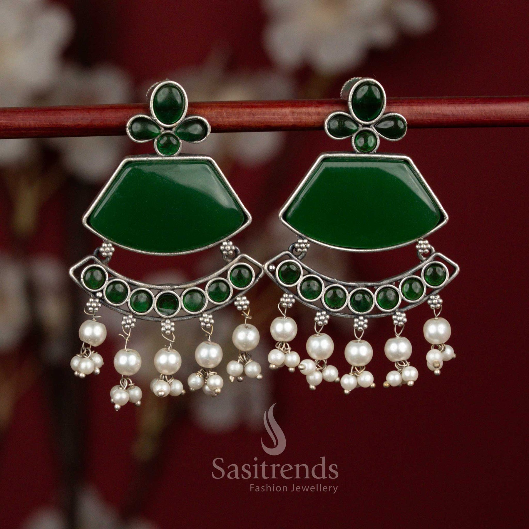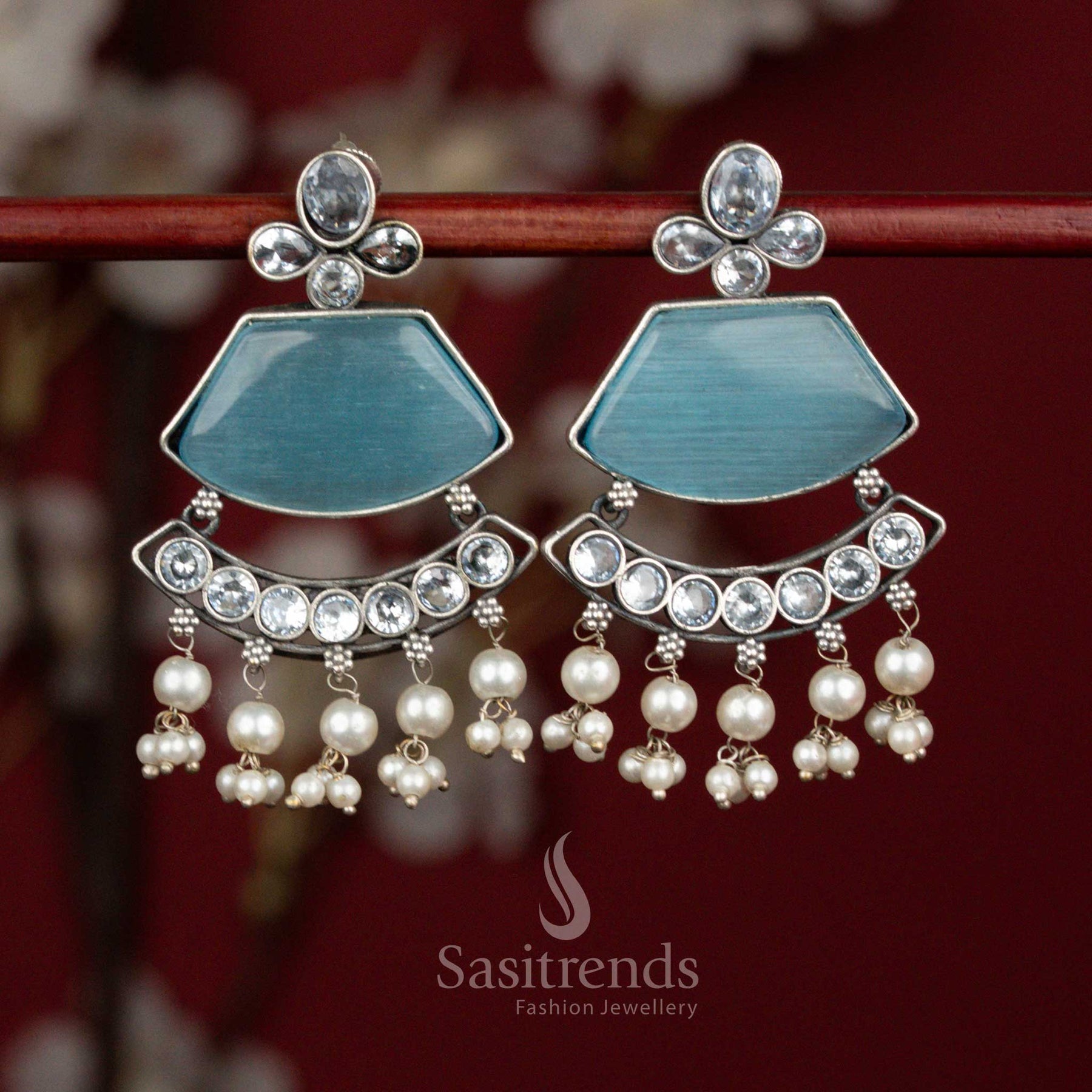 Description: The earrings from Sasitrends combine bold structure with graceful detailing, creating a refined statement piece for elevated occasions. The wide top form and layered pearl tassels offer a look that feels party wear elegant while remaining versatile for various celebrations. The upper section is designed with a smooth polished surface framed in oxidised silver plating. A subtle floral-inspired accent enhances the structure, giving the earrings a defined and composed appearance that looks rich without appearing excessive. A curved crescent element forms the central highlight of the design, adding depth and traditional influence. The evenly spaced detailing along the crescent creates balance and rhythm, blending classic inspiration with contemporary styling. The lower edge is completed with cascading pearl tassels that add gentle movement and visual softness. This flowing finish enhances the overall elegance of the earrings, making them stand out beautifully when worn. These earrings are suitable for festive functions, wedding gatherings, ethnic office days, family celebrations, and elegant evening wear. Their party wear elegant appeal pairs well with sarees, ethnic suits, lehengas, and modern fusion outfits.