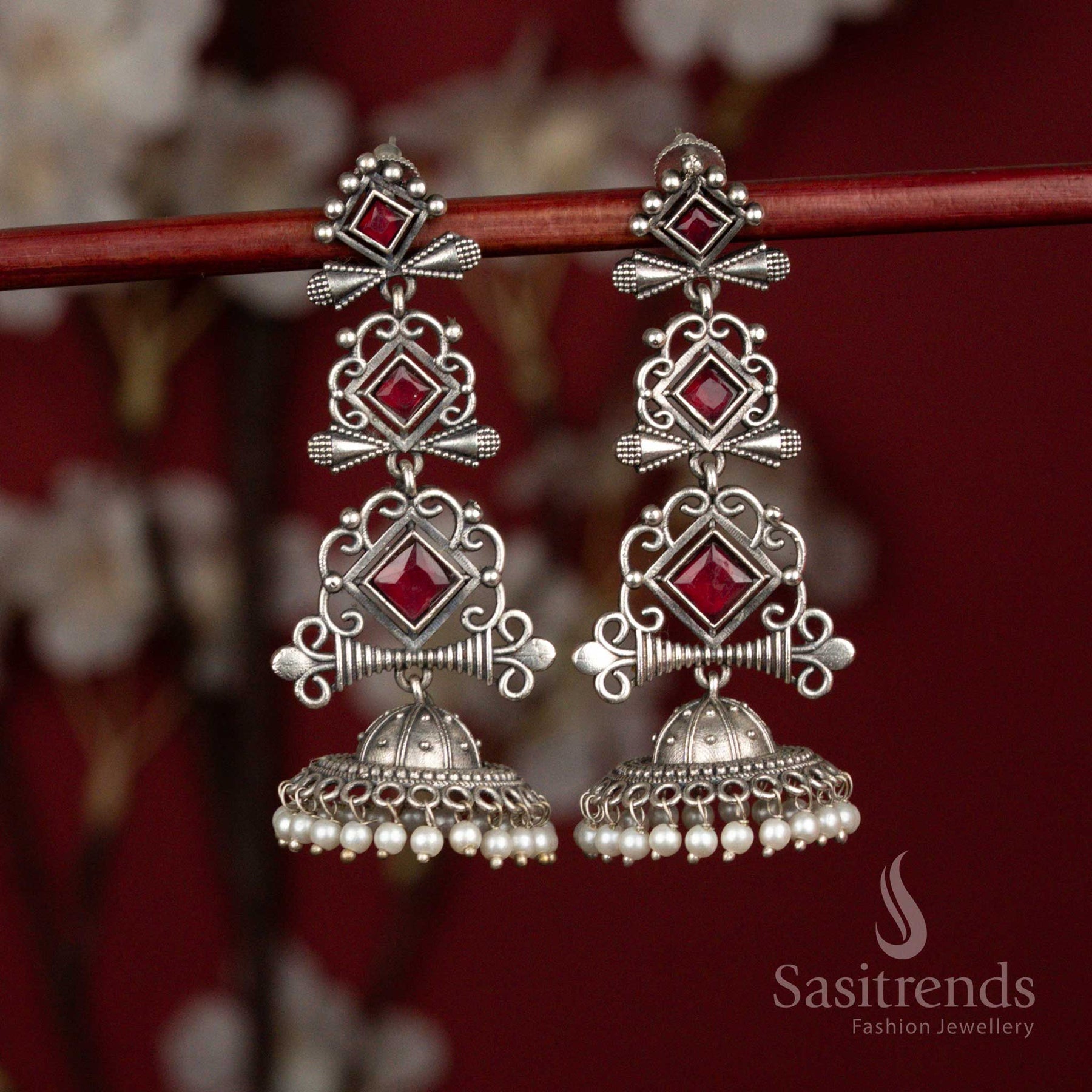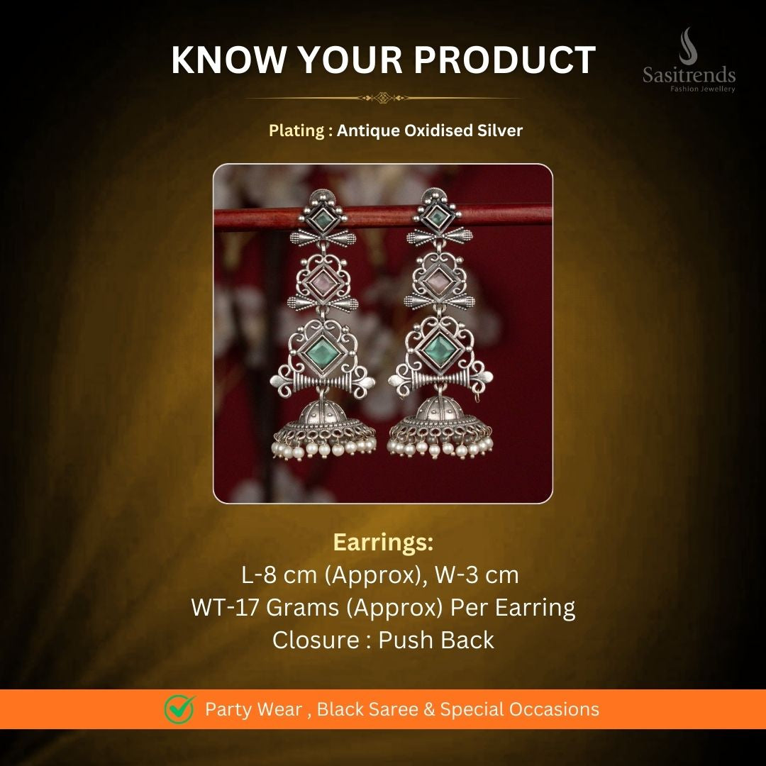 Description: The Antique Oxidised 92.5 Silver Plated Stone Jhumka Earrings from Sasitrends feature a striking long-format design that blends traditional elegance with a bold contemporary appeal. The vertical alignment creates a graceful flow, making these earrings a true statement accessory. These earrings showcase a layered geometric structure, with square-shaped stone settings framed in intricate oxidised silver detailing. Delicate scroll-inspired metalwork connects each segment, giving the design depth, symmetry, and refined craftsmanship. The lower section is finished with a beautifully carved oxidised dome-shaped jhumka, enhanced with traditional engraving patterns. Fine pearl bead hangings line the base, adding movement and a soft festive charm to the overall design. Although the earrings appear bold and grand, they are thoughtfully structured to feel comfortable when worn. The balanced design ensures ease of wear while still delivering a rich, eye-catching presence. Perfect as party wear jewellery, these oxidised jhumka earrings pair beautifully with black sarees, silk sarees, ethnic kurtas, Anarkalis, and Indo-western outfits. Ideal for weddings, festive celebrations, evening functions, and special occasions.