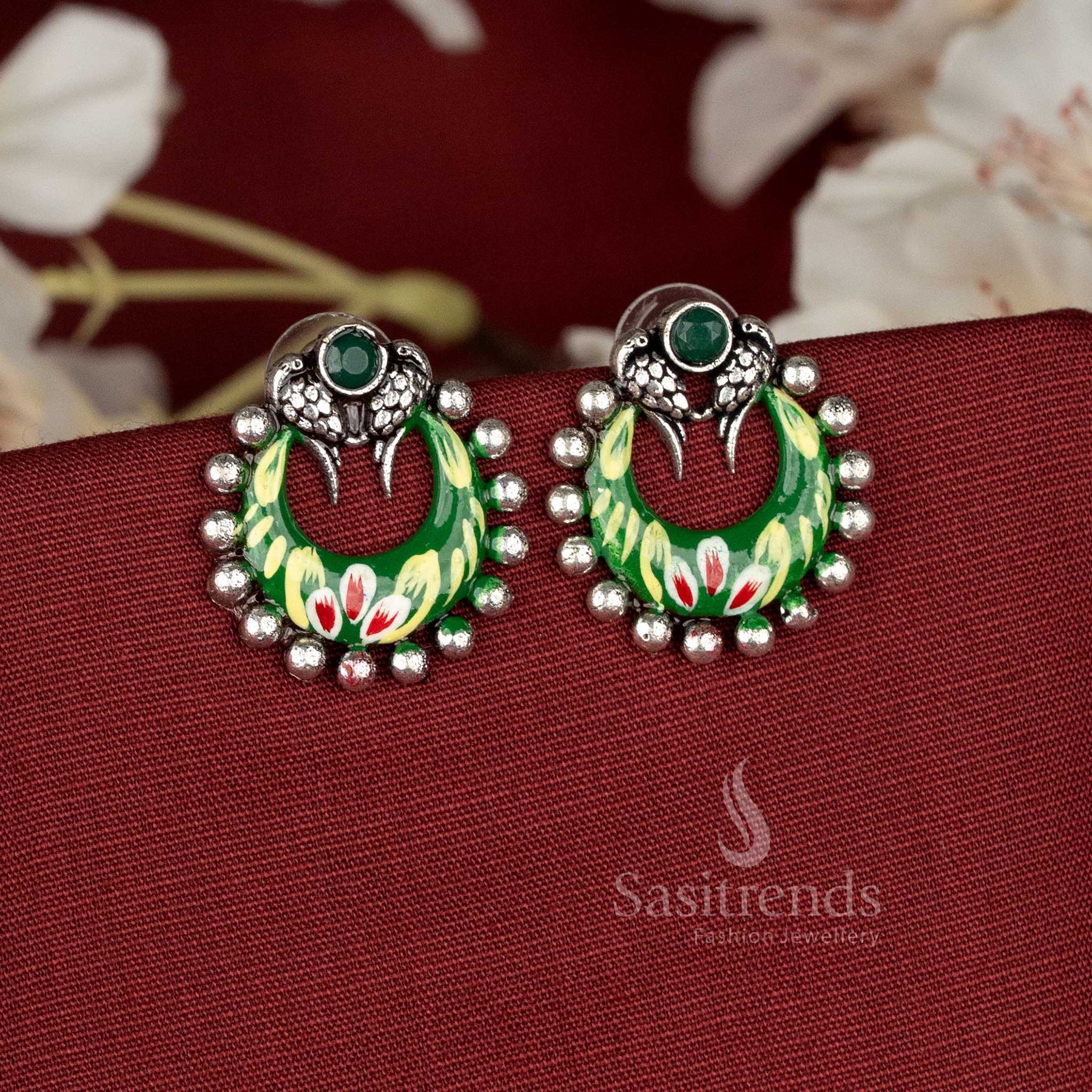 - Care: Keep the earrings away from water, perfumes, deodorants, and sprays. Store them in an airtight pouch after use. Gently wipe with a soft cloth to maintain the hand-painted surface and oxidised finish.