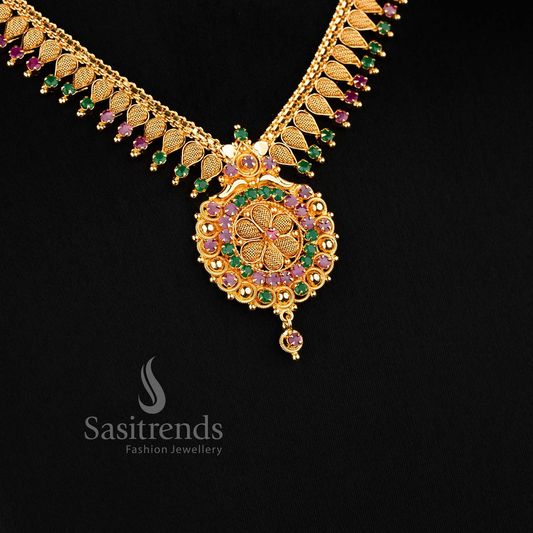 - Product Description: The Sasitrends Micro Gold-Plated Necklace Set can provide a sophisticated touch to any traditional outfit. This gorgeous piece of jewellery is a round pendant with a gorgeous flower design that is encrusted with sparkling American diamond stones. It's the ideal option for formal events because of the sophisticated touch added by the water drop net pattern on the left and right chains. This set is a picture of luxury and elegance, expertly crafted from premium brass material and coated with 24-carat pure gold. To subtly elevate your appearance, wear it with sarees made of semi-silk or pattu silk. This set is an exquisite and treasured gift for your loved ones; it is the epitome of style and craftsmanship.