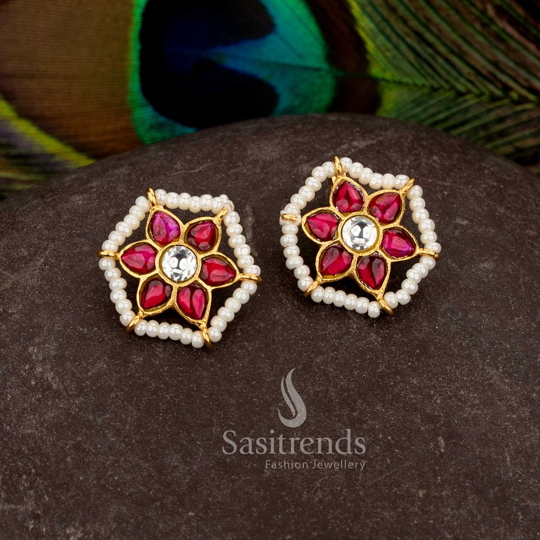 Brand: Sasitrends presents premium 24K Jadau gold plated jewellery with floral motifs, Kundan stone accents, and pearl detailing, designed for weddings, festive occasions, and temple-inspired styling.
