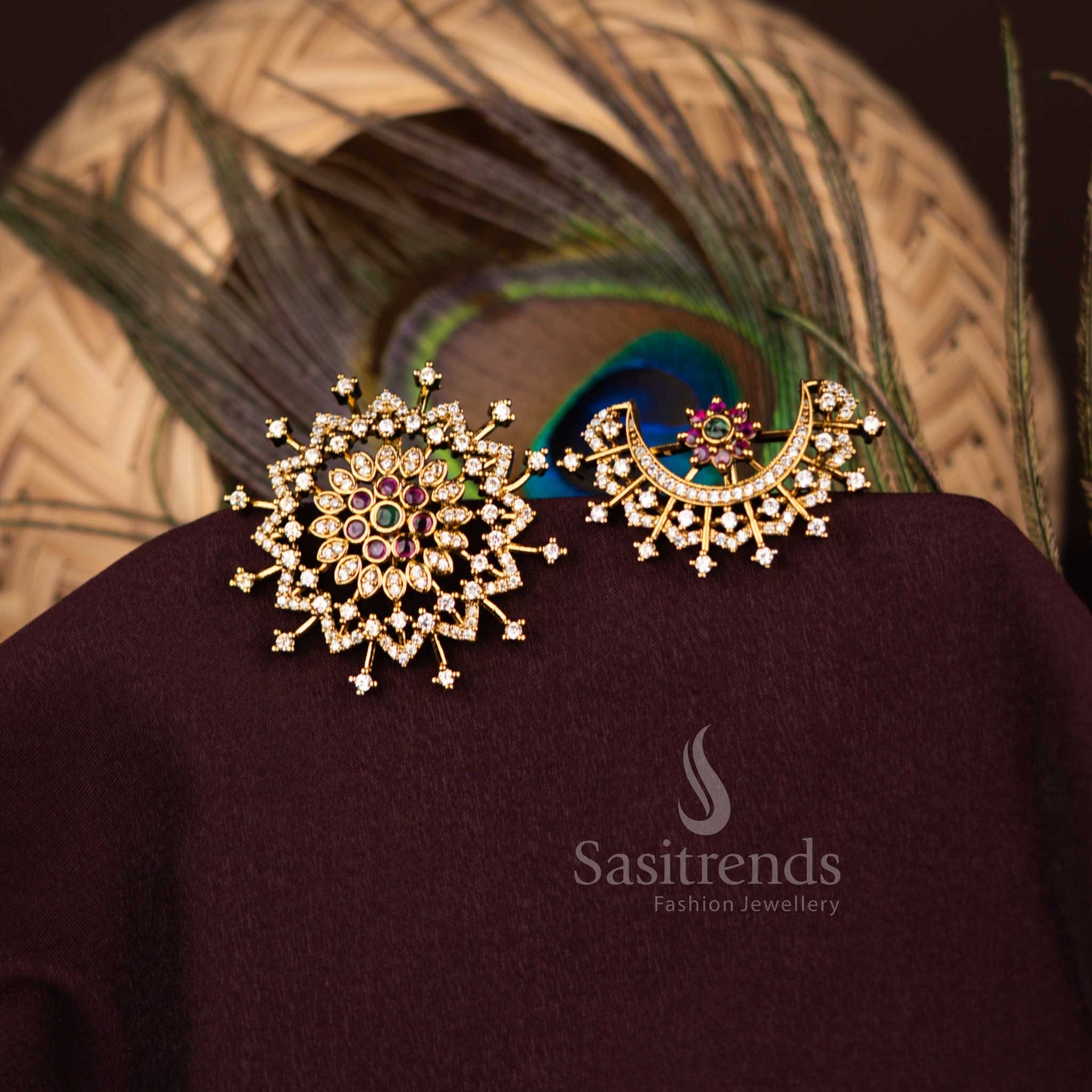 Brand: Sasitrends is renowned for artistic temple designs crafted with premium quality finishing and pristine workmanship. From floral starburst motifs to crescent ornaments, each creation reflects devotion and culture. Sasitrends brings elegant heritage jewellery to weddings and festive occasions, offering pieces admired for their classic artistry and glorious beauty across generations.