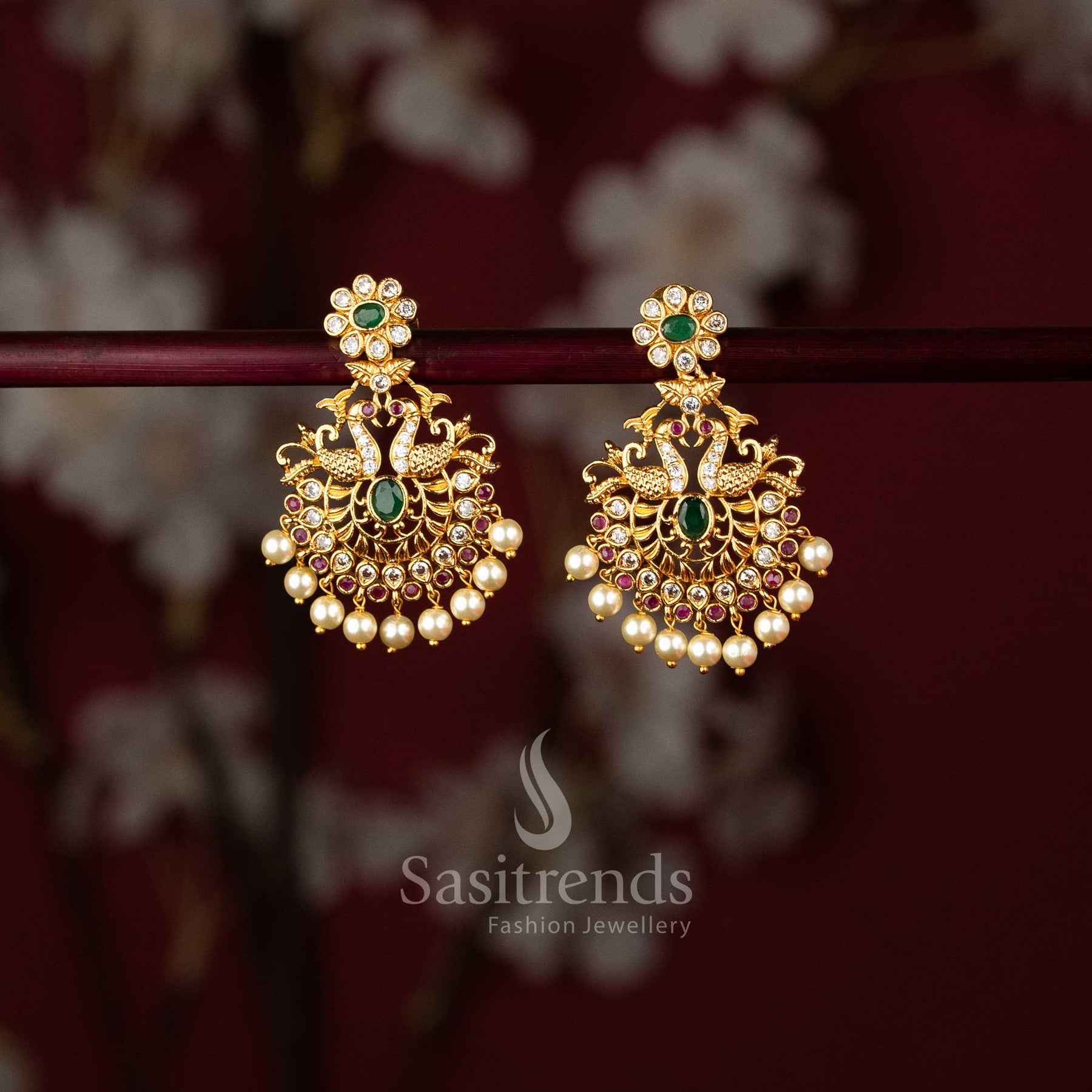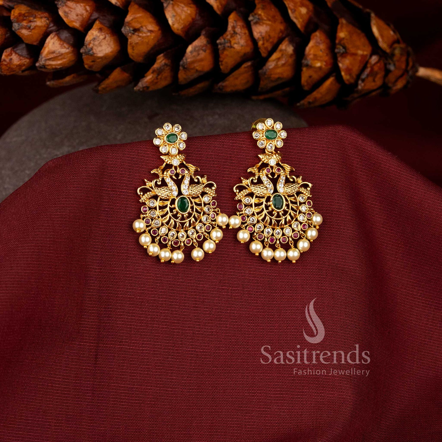 - Product Description: Elevate your traditional look with these exquisite Brass Earrings. Skillfully crafted using high-quality brass material, these earrings exude elegance and charm. The intricate design is adorned with a mesmerizing matte gold plating, giving them a rich and luxurious appearance. To enhance their allure, each earring is studded with sparkling American Diamond stones, adding a touch of dazzle to your ensemble. The top of the earrings features a beautiful flower motif, with a captivating oval-shaped stone at its center, encircled by delicate thilak-shaped stones. Moving downward, the earrings showcase a central oval-shaped stone, flanked by two stunning peacocks gracefully facing each other. The oval stone itself is embellished with a floral pattern, accented by thilak and round AD stones, creating a mesmerizing and captivating visual effect. Adding to their charm and elegance are the dazzling hanging pearl drops at the base, swaying gracefully with every movement, adding a touch of sophistication to your look.These traditional heavy earrings are an ideal choice for weddings and bridals, as they effortlessly complement traditional and festival occasions. Whether it's a wedding party, reception, or baby shower, these exquisite earrings will add a touch of regal splendor to your attire. A wide range of traditional outfits, including sarees, half sarees, Leganga, and kurtis. Their timeless design and intricate craftsmanship make them a must-have addition to your jewelry collection. With their blend of traditional charm, these AD earrings are sure to garner compliments and make you stand out at any special event.