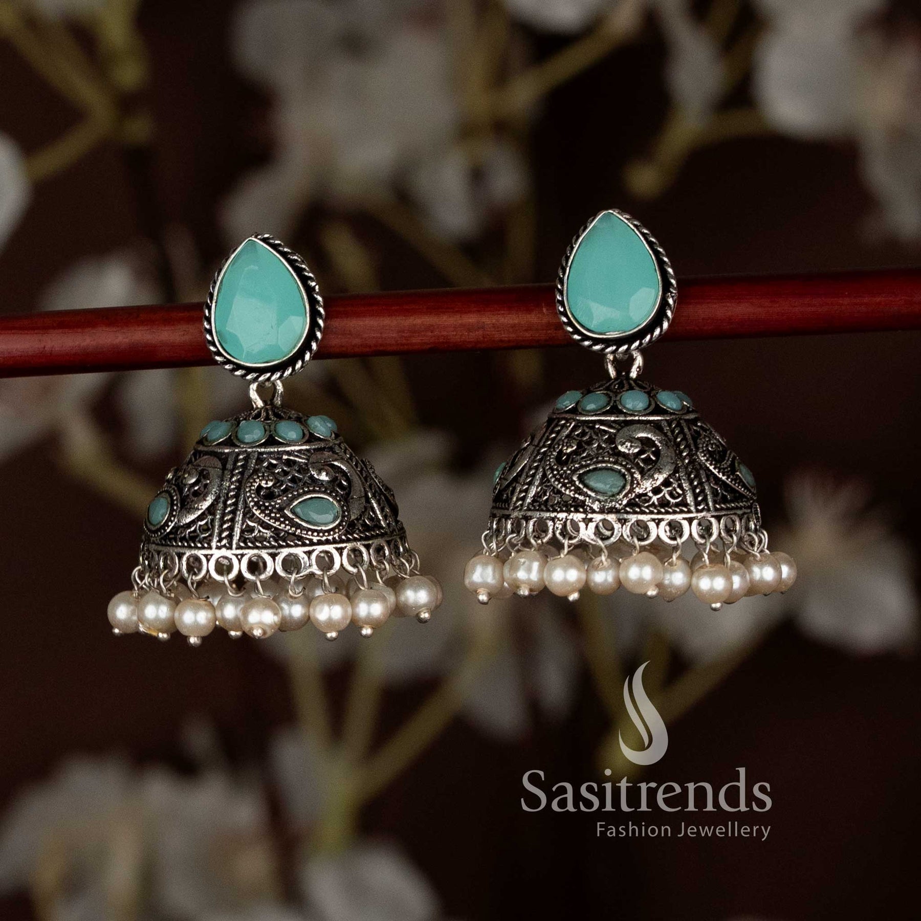 Oxidised Teardrop Stud Peacock Motif Jhumka Earrings with Pearl Drops – Ethnic Heritage Design