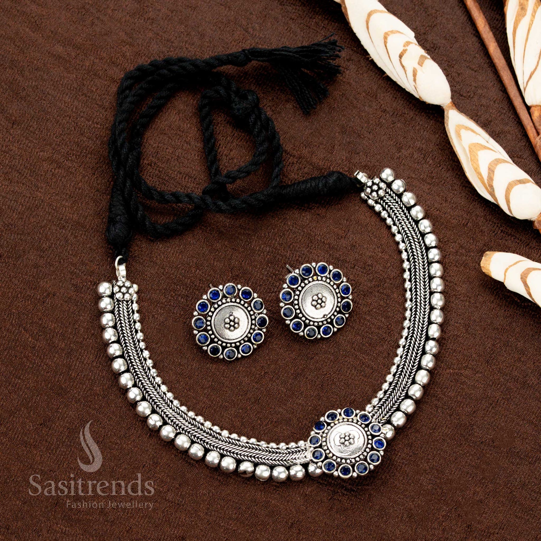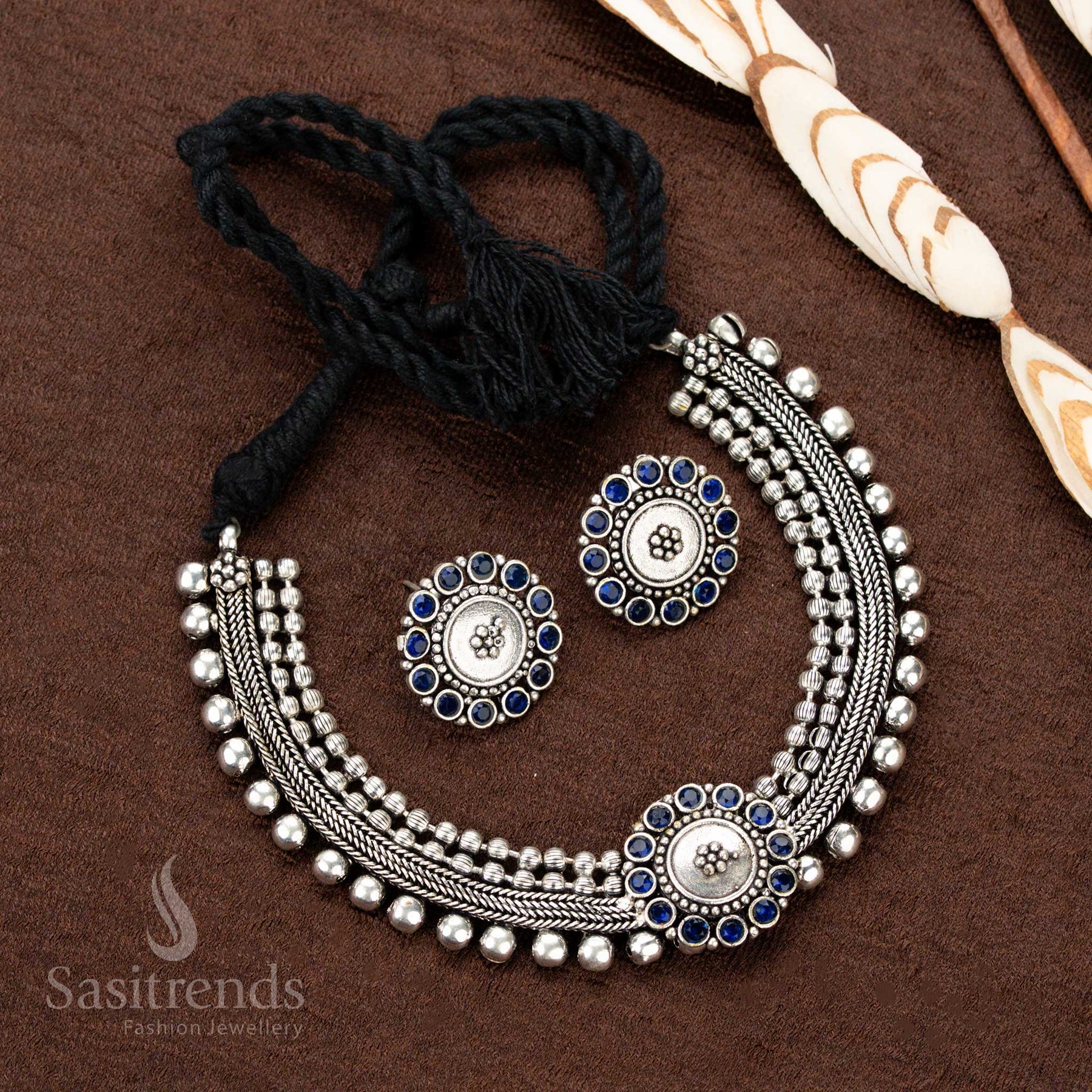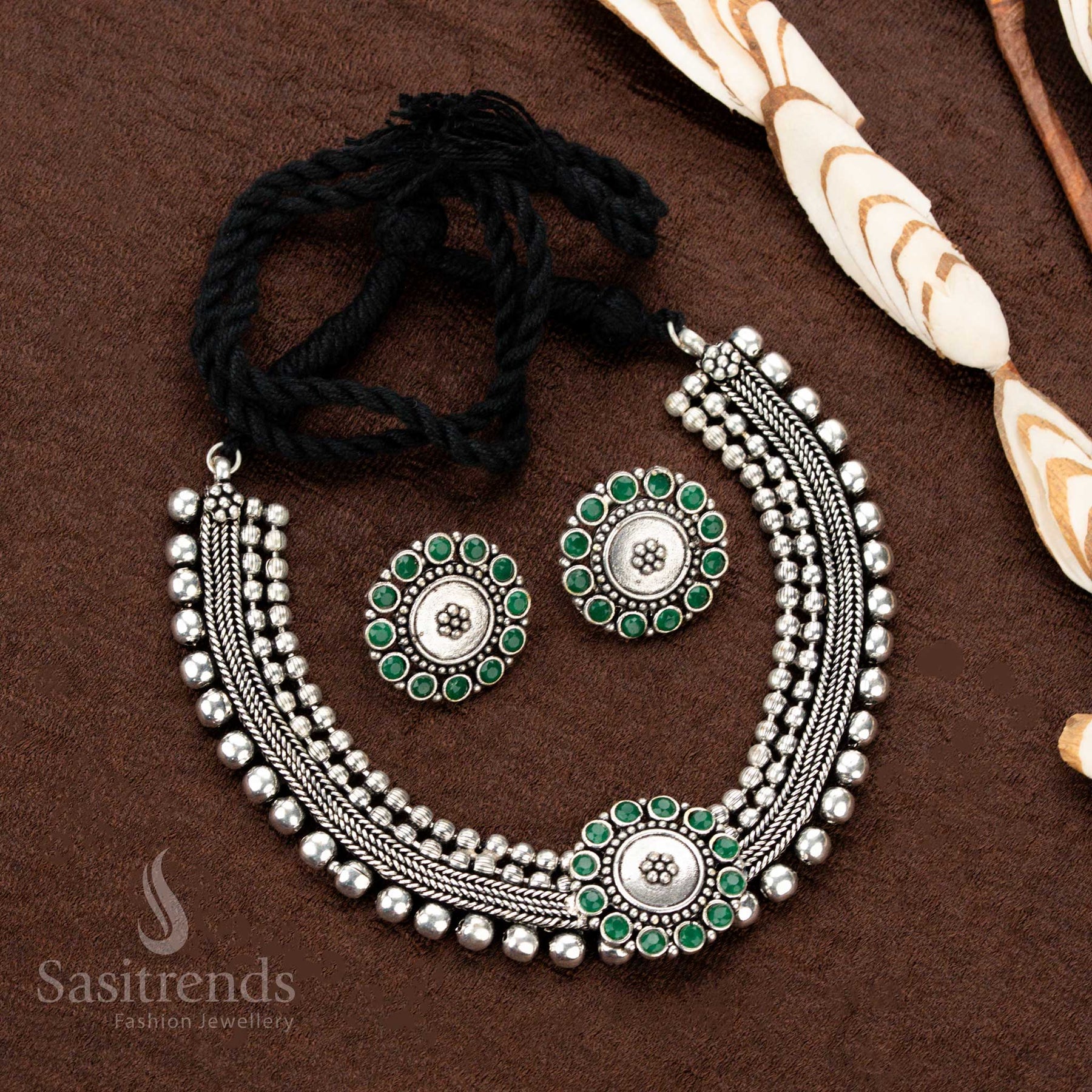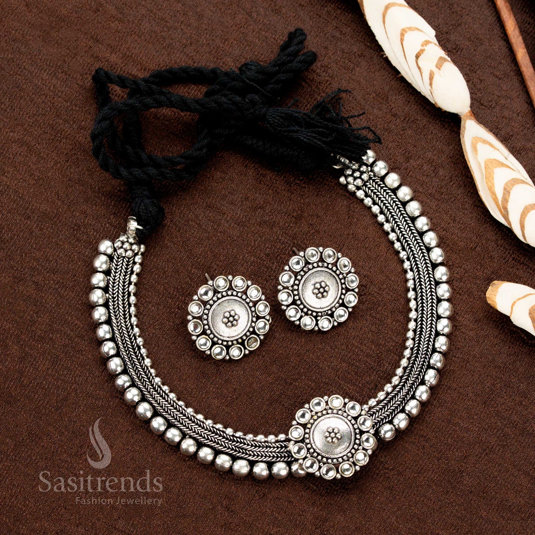 Stunning Kolapuri Oxidised Choker Necklace Jewellery Set with Bold Dual-Tone Floral Stone Motif Design – Perfect for Navaratri, Sarees & Festive Occasions - Sasitrends