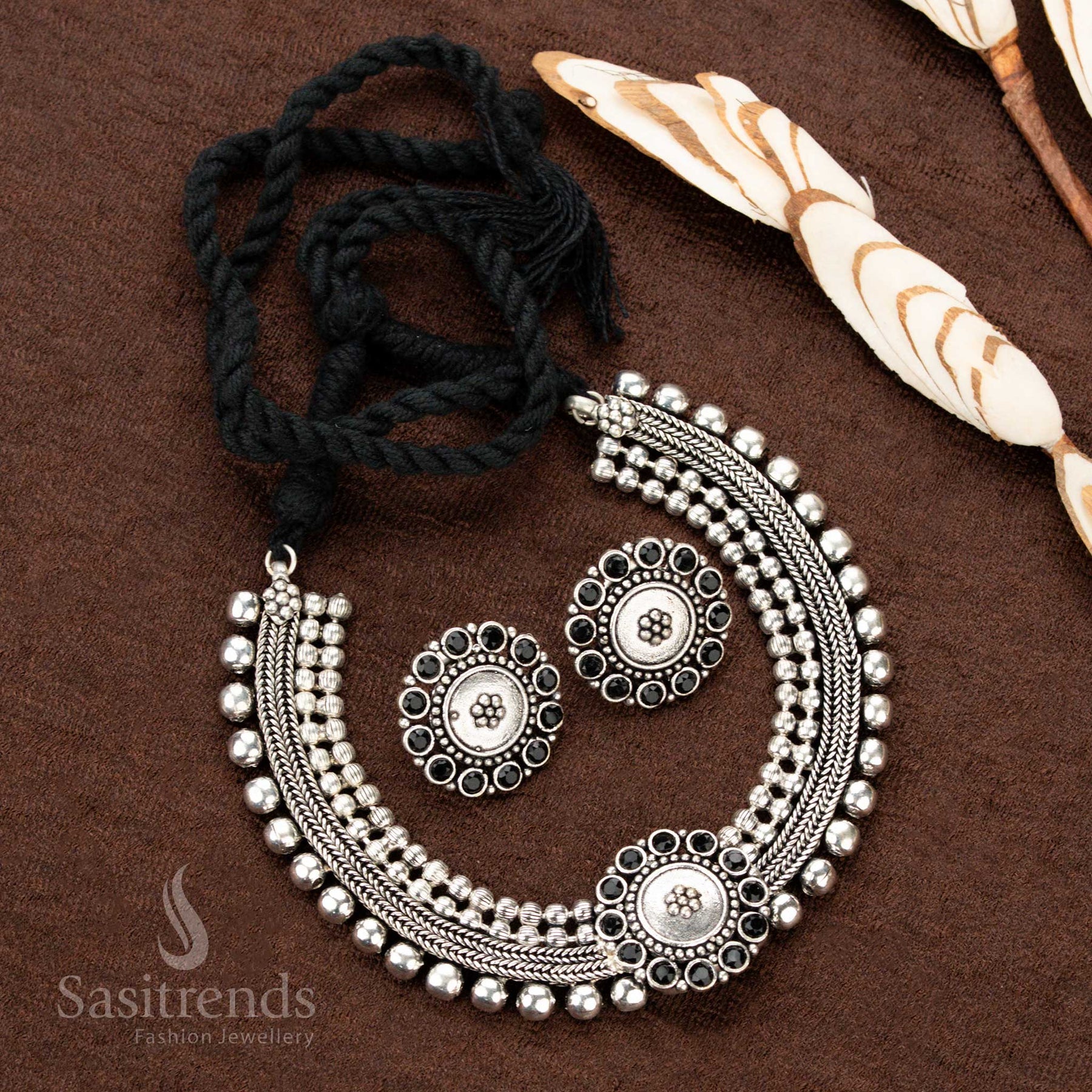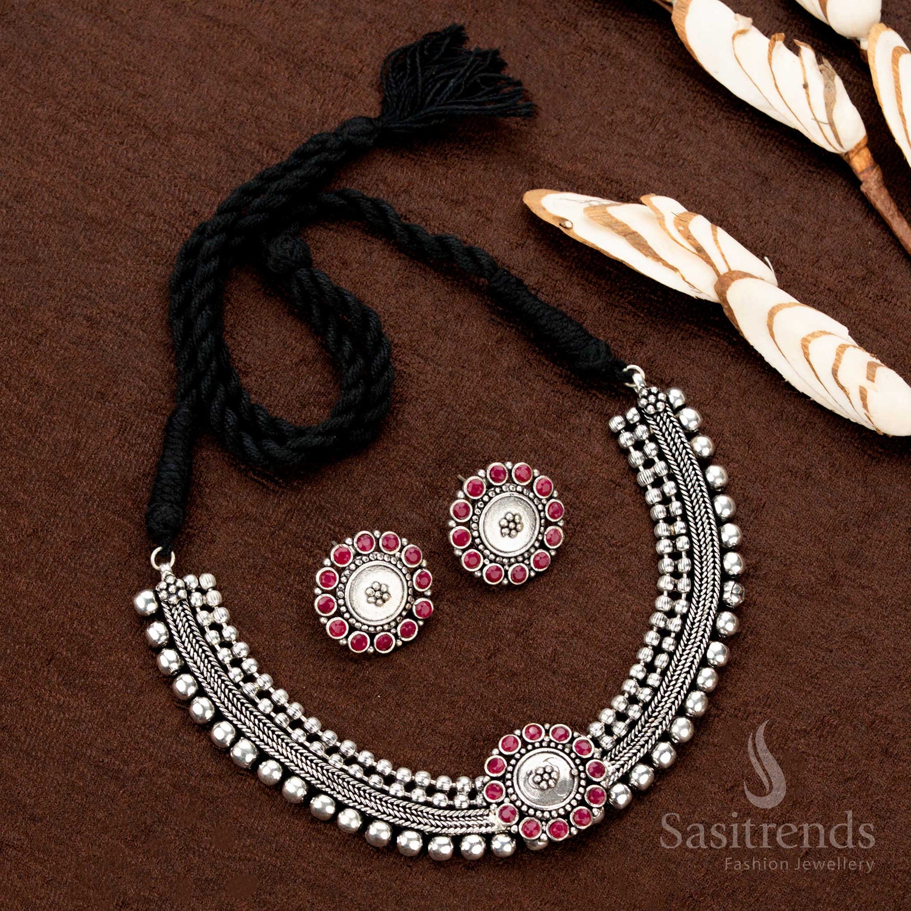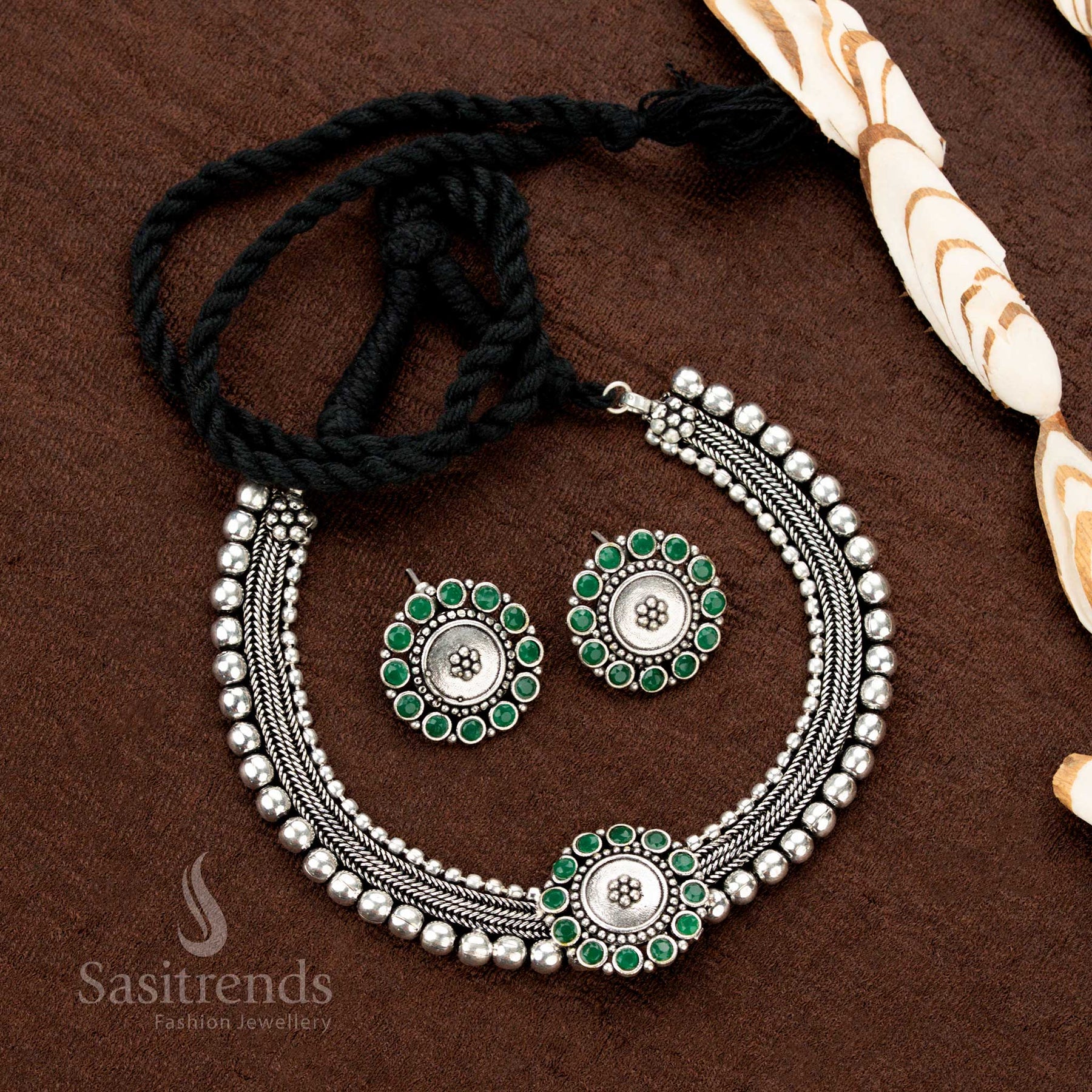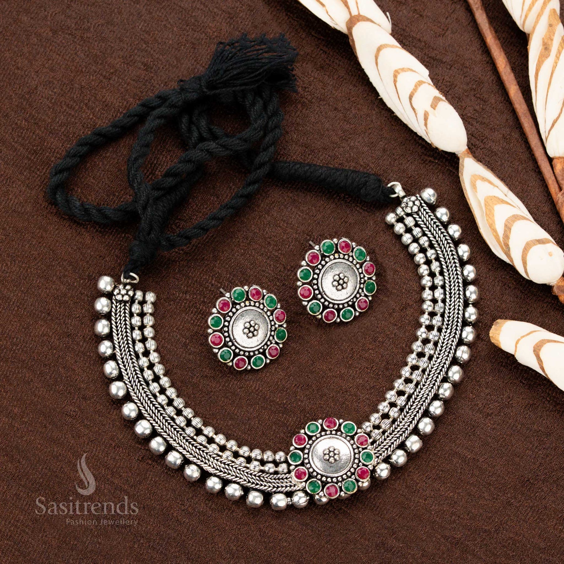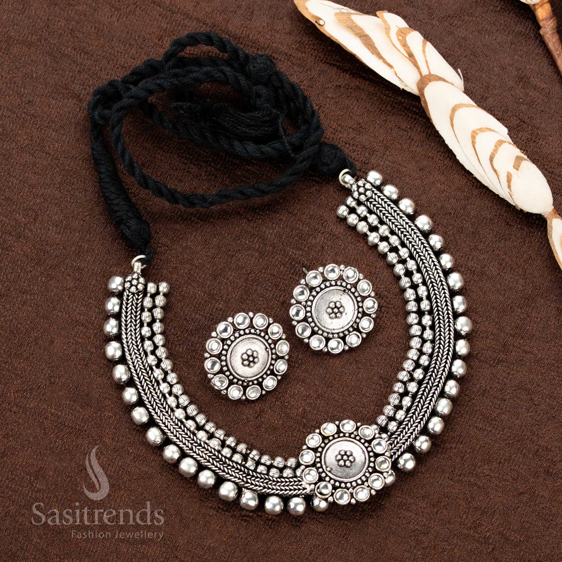 Stunning Kolapuri Oxidised Choker Necklace Jewellery Set with Bold Dual-Tone Floral Stone Motif Design – Perfect for Navaratri, Sarees & Festive Occasions - Sasitrends