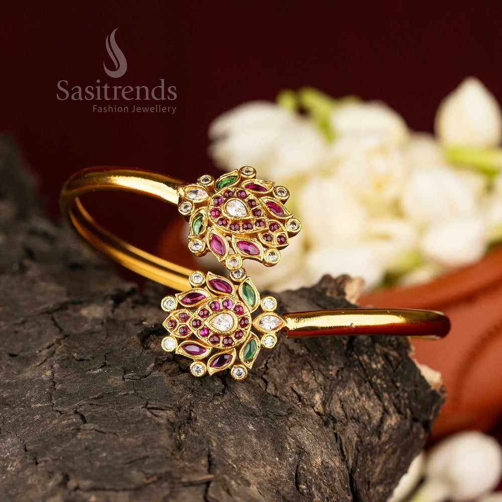 Sasitrends | Temple Traditional Lotus Motif Matte Gold-Plated Semi Openable Bracelet with AD Stones