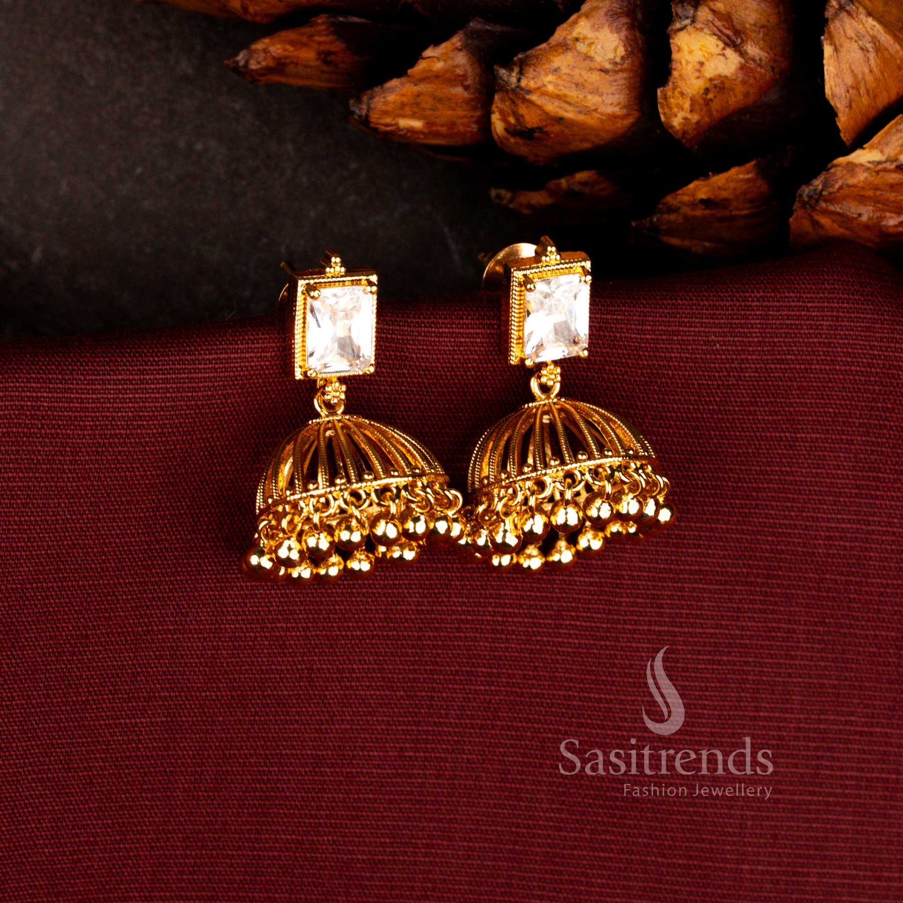 Description: Embrace timeless elegance with our Micro Gold Plated Rectangular AD Stone Studded Tops with Jhumka, a graceful fusion of traditional design and contemporary sparkle. These stunning earrings feature a striking rectangular-shaped high-polish American Diamond stone at the top, delicately held in a detailed frame setting, giving a rich and regal finish. The jhumka portion below is designed in an elegant dome-shaped bell structure, adorned with intricate openwork bars and finished with multiple hanging gold beads that move with a gentle sway.Crafted using Micro Gold Plating with 24 Carat Pure Gold, these earrings are Guaranteed to look like real gold, making them a luxurious yet pocket-friendly addition to your jewellery collection. The dazzling white stone at the top enhances its glamour quotient, while the golden jhumka brings in that ethnic essence that suits all festive and traditional outfits.Perfect for sarees, temple wear, and ethnic celebrations, this earring pair is a customer favorite due to its comfort, lightweight build, and eye-catching finish. Whether you're attending a wedding or looking to gift something memorable, this is a choice that never fails to impress.