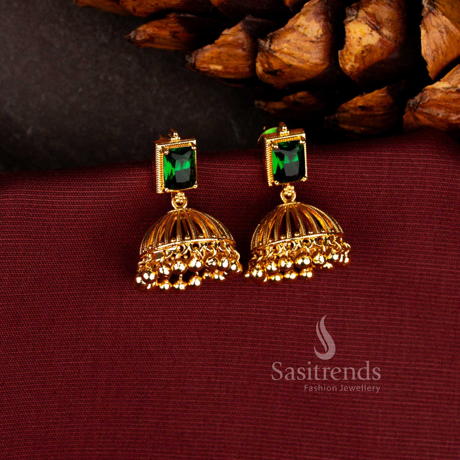 Attractive Micro Gold Plated Rectangular Stone Studded Jhumka Earrings with Traditional Bell Dome Design - Sasitrends